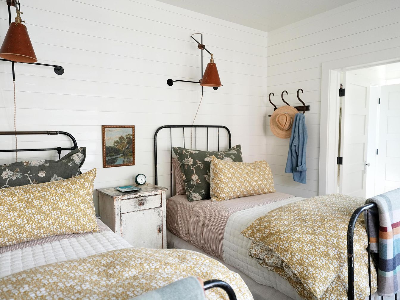 This cozy twin bedroom features two black metal-framed beds positioned closely, creating a symmetrical and inviting layout. The walls are clad in white shiplap paneling, enhancing the bright and airy farmhouse aesthetic. Bedding includes mustard yellow floral quilts paired with muted green floral pillows, complemented by neutral-toned sheets. A small, weathered white nightstand sits between the beds, holding a vintage-style clock and a small dish. Industrial-style wall sconces with rust-colored shades hang above each bed for focused lighting. A wall-mounted rustic coat rack holds a straw hat and a cozy blue jacket, adding personal charm.