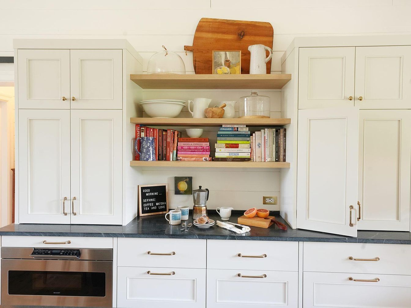 This cozy kitchen nook features elegant white cabinetry with classic panel detailing, complemented by sleek brass hardware that adds a touch of warmth. The dark marble countertop contrasts beautifully with the light cabinets, creating visual depth. Open wooden shelves are used to display a curated collection of colorful cookbooks, white ceramic dishes, and rustic decor elements like a wooden cutting board and a distressed pitcher. A small espresso maker and mugs sit ready for use, inviting a morning coffee ritual. The space is both functional and inviting, blending modern convenience with farmhouse charm in a calm, neutral palette.