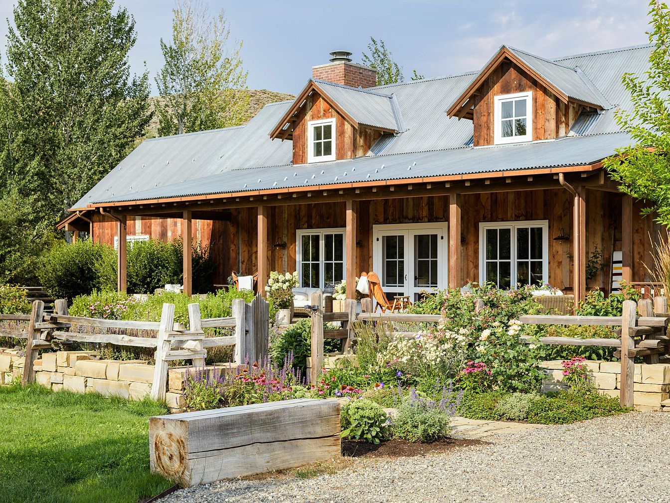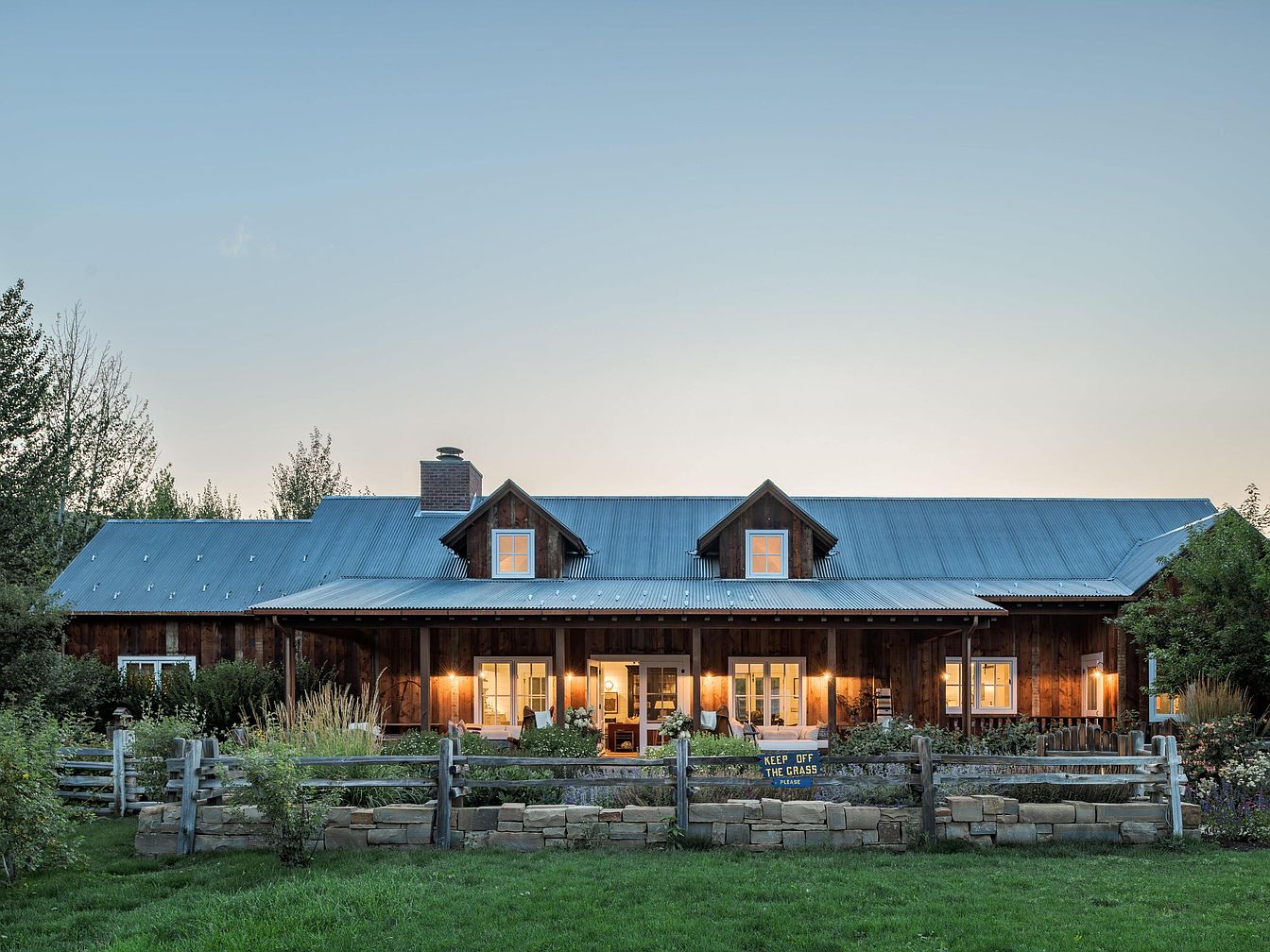 This charming exterior view focuses on the backyard of a home designed with a rustic, farmhouse aesthetic. The facade features warm, dark wooden siding contrasted by a cool-toned corrugated metal roof with two dormer windows, creating a balanced, cozy look. Soft, amber lighting from wall sconces and interior windows adds a welcoming glow. A covered porch with seating spans the width of the house, inviting outdoor relaxation. The yard is bordered by a wooden split-rail fence with a stone base and lush landscaping, blending natural elements harmoniously. A “Keep Off the Grass” sign adds a quaint, personal touch to the space.