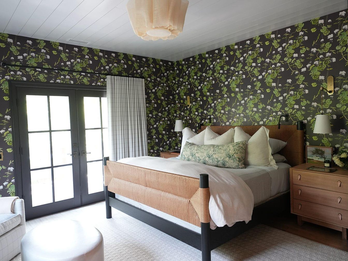 This intimate bedroom features a bold floral wallpaper in dark tones with lush green and white botanical designs creating a dynamic backdrop. The bed boasts a sleek black frame accented with natural woven elements, blending modern and rustic vibes. Plush white bedding with a mix of solid and patterned pillows adds comfort and visual interest. Flanking the bed, two mid-century modern wooden nightstands provide functionality while golden sconces above deliver subtle warm lighting. Large black-framed French doors draped partially with soft, white checkered curtains allow natural light to brighten the space, enhancing its inviting atmosphere.