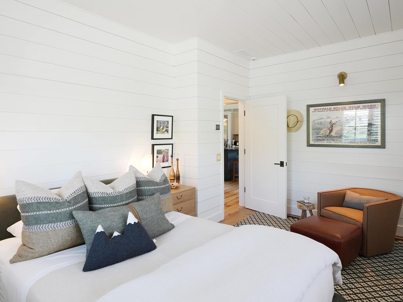 This inviting bedroom corner blends rustic charm with modern comfort, featuring white horizontal shiplap walls and ceiling enhancing the airy feel. A large bed with neutral-toned linens and an array of textured pillows, including woolen cushions with mountain motifs, anchors the room. Light wood nightstands add warmth, paired with contemporary accent lamps. Adjacent to the bed is a cushioned leather armchair and matching ottoman on a patterned area rug, creating a cozy seating space. Subtle Western details, like a framed Buffalo Bill print and a cowboy hat hanging by the door, infuse personality and regional character into the serene design.