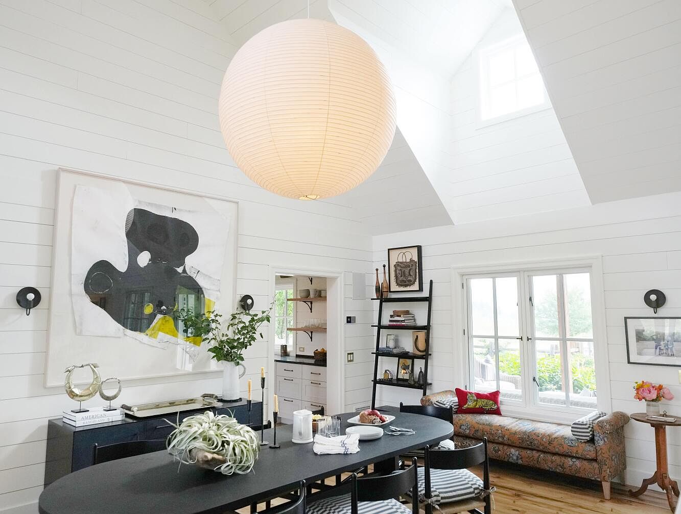 This bright dining area features vaulted ceilings with white shiplap walls that create an airy and expansive feel. A large, spherical pendant light hangs above a sleek, black oval dining table surrounded by cushioned chairs with striped seat covers. Against one wall, a modern black sideboard holds decorative accents including metallic sculptures and candles. A bold abstract artwork in monochrome with yellow accents anchors the space. Adjacent to the dining area, a patterned upholstered chaise lounge with vibrant red and striped bolster pillows sits beneath a window, complemented by a ladder shelf displaying books and art. Hardwood floors add warmth, and natural light floods the room from the windows and skylight, blending modern and cozy elements seamlessly.