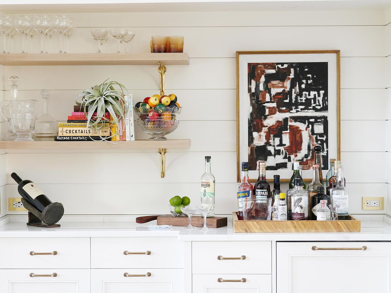 This sleek home bar counter blends modern and classic elements with a clean white palette. The cabinetry below features white shaker-style doors with brass handles, offering ample storage and a polished look. Above, two natural wood floating shelves with brass brackets hold an elegant collection of glassware, colorful cocktail books, and a decorative plant. The counter itself is neatly arranged: a wine bottle on a stand lies to the left, while a wooden tray on the right organizes various liquor bottles and mixers for easy access. A large abstract art piece in black, brown, and white tones adds depth and contrast to the otherwise light, neutral space. The shiplap wall background and brass electrical outlet covers further enhance the refined yet cozy vibe, making this a stylish and functional entertaining area.