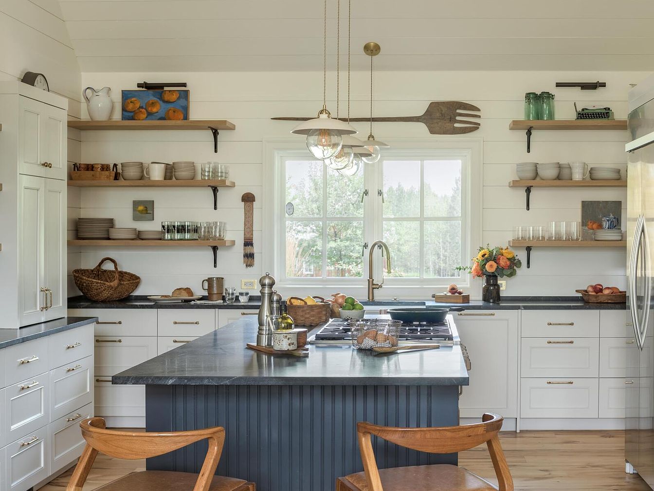 This bright kitchen centers around a large island with a blue beadboard base and a dark gray polished countertop, ideal for both prep and casual dining with two wooden chairs in front. The surrounding cabinetry is white with brass hardware, complementing the black countertops. Open wooden shelves flanking a double window above the sink showcase simple dishware, glassware, and decorative elements, including a rustic, oversized wooden fork mounted above. The walls and ceiling are clad in white horizontal shiplap, enhancing the clean, airy farmhouse aesthetic. Pendant lights with brass fixtures hang over the island, adding warmth and charm.