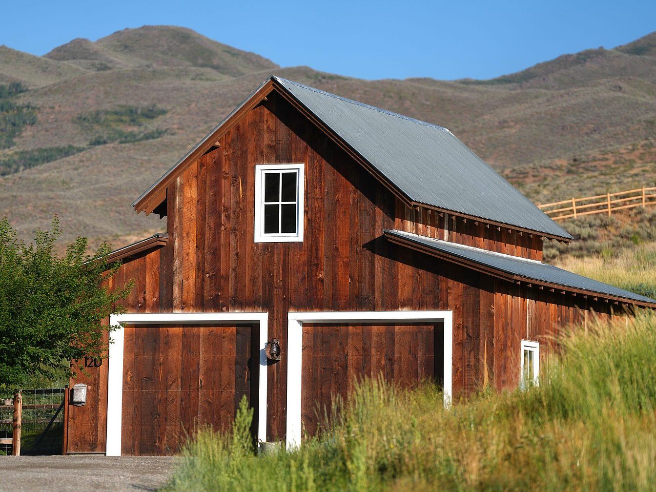This charming garage exterior features natural wood plank siding with a rich, warm stain that complements its rural surroundings. The structure is highlighted by two large garage doors framed in crisp white, enhancing the rustic character with a touch of clean contrast. A single window positioned centrally above the doors admits natural light inside. The metal roof in muted grey adds a functional yet subtle industrial touch, blending seamlessly with the expansive mountainous backdrop. Set amid native shrubbery and grasses, this garage exemplifies a practical, picturesque outbuilding suited to a countryside landscape.