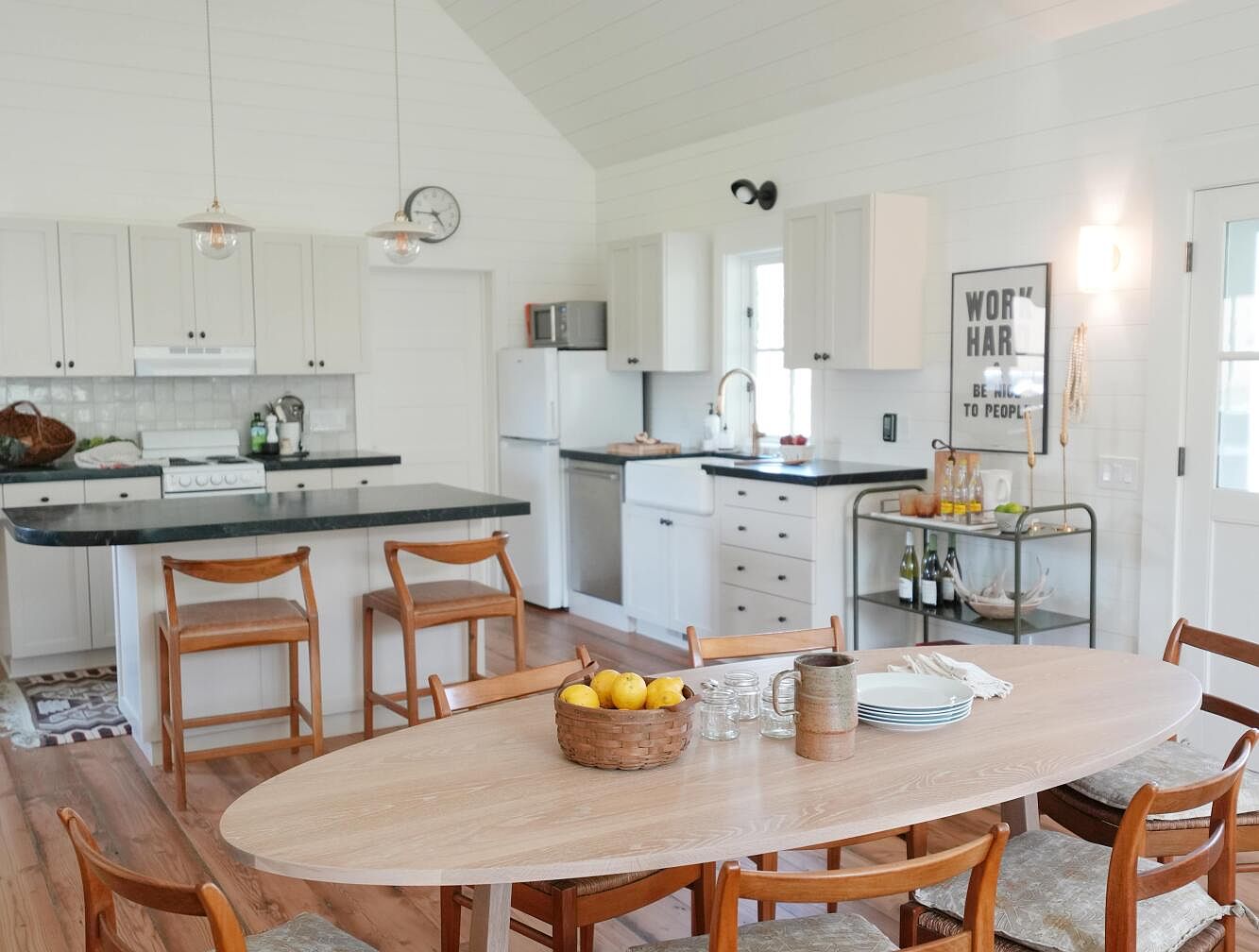 This open-plan kitchen and dining area presents a clean, inviting atmosphere with bright white cabinetry and shiplap walls that enhance the airy feel. The kitchen island, topped with a sleek black countertop, includes a pair of wooden stools that add warmth and contrast. Adjacent to the island, a long oval wooden dining table surrounded by simple wooden chairs invites communal meals. The flooring features natural wood tones, complementing the furniture. Subtle rustic touches appear in the woven basket centerpiece and ceramic mugs, while modern pendant lights and a motivational framed print bring personality and charm to the space.