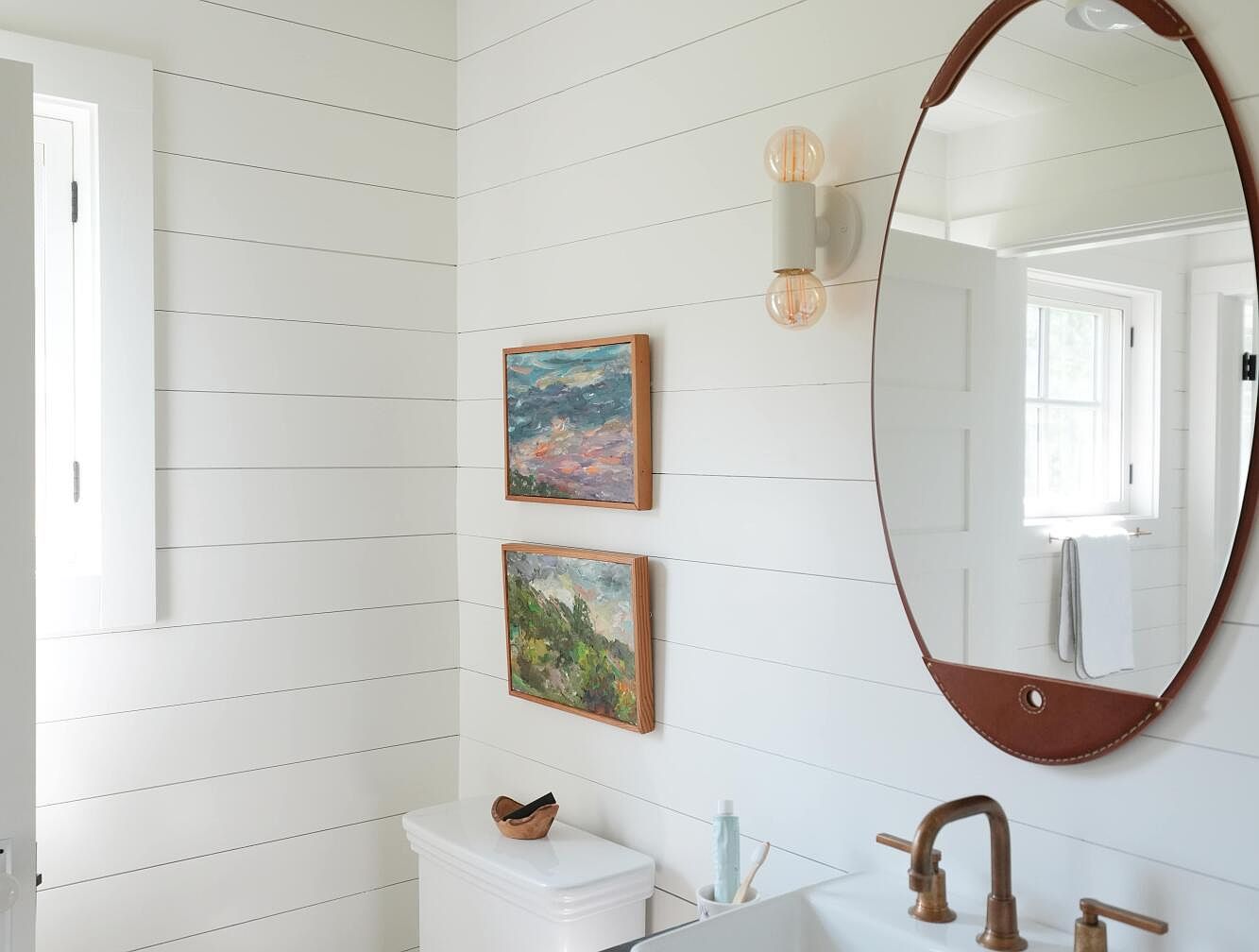 This bathroom features a clean, farmhouse-inspired aesthetic with horizontal white shiplap walls creating a bright and airy atmosphere. A large oval mirror with a rich leather strap border hangs above the sink, adding warmth and texture to the space. The fixtures, including the faucet and handles, have a vintage brass finish, enhancing the rustic charm. Two small framed landscape paintings bring subtle color and artistic interest to the wall above the white porcelain toilet. Soft natural light filters through a window with classic white trim, further elevating the serene, minimalist vibe.