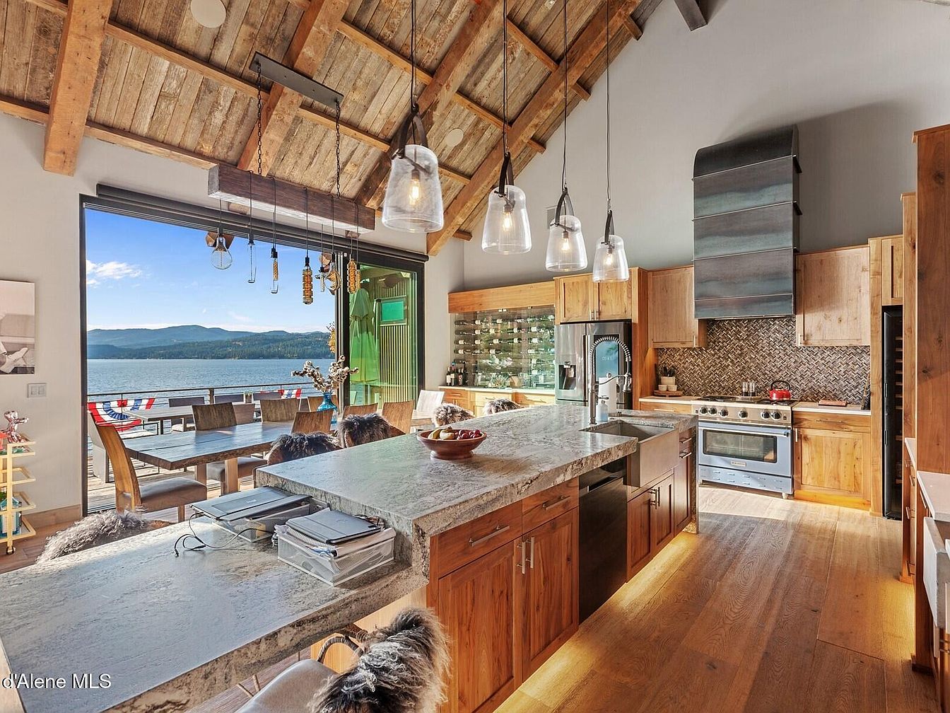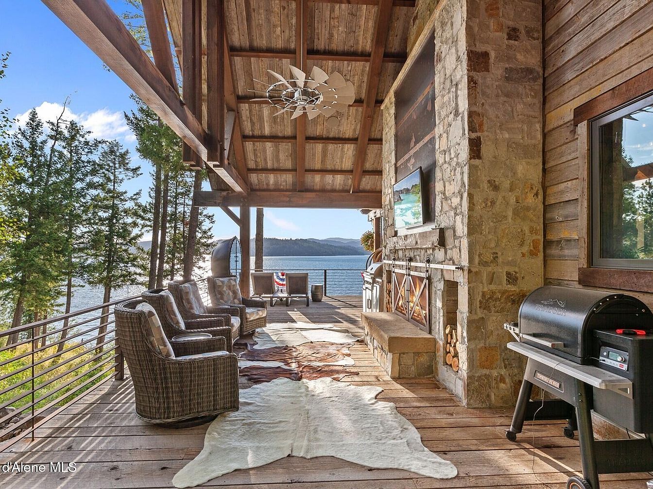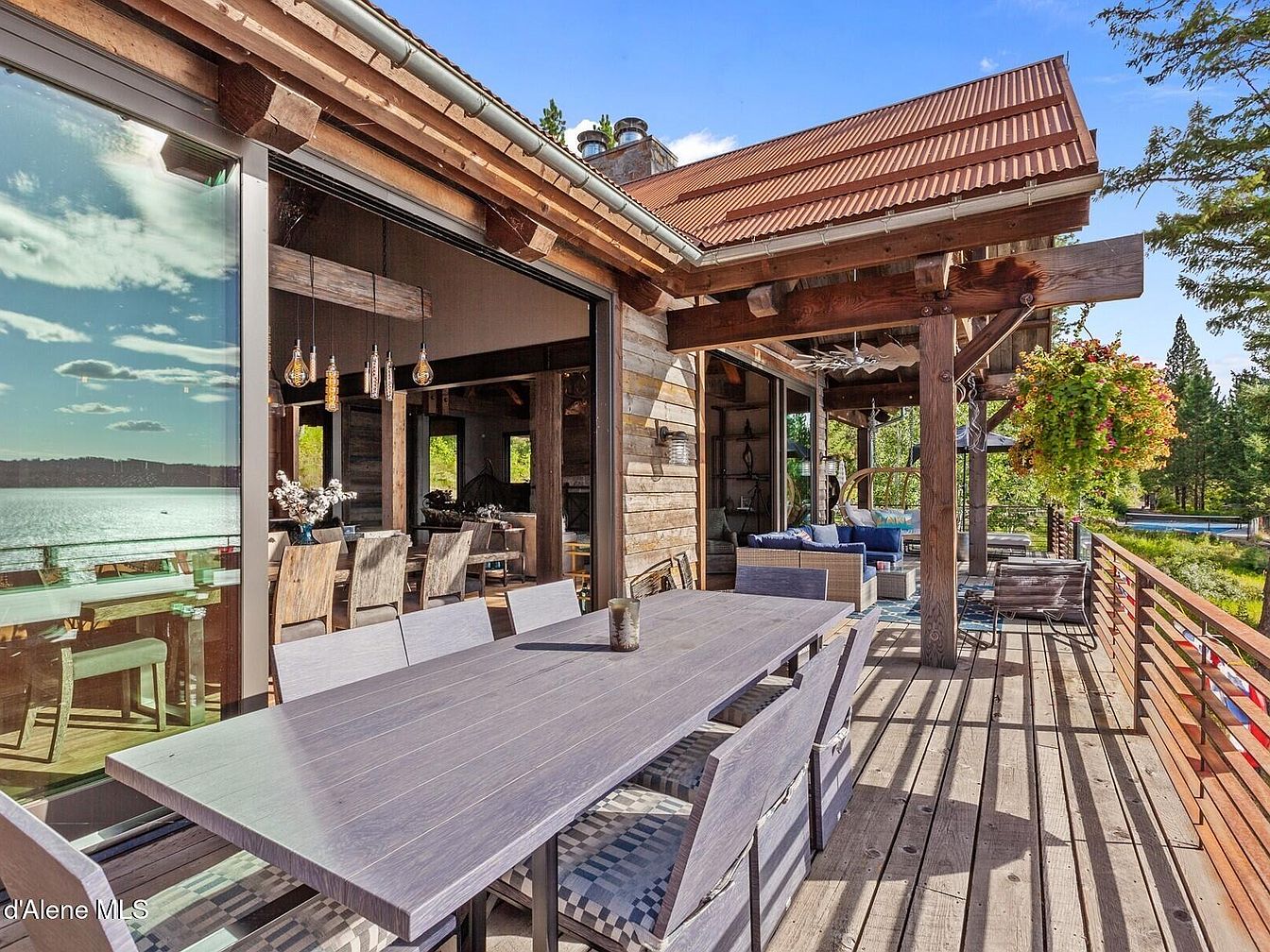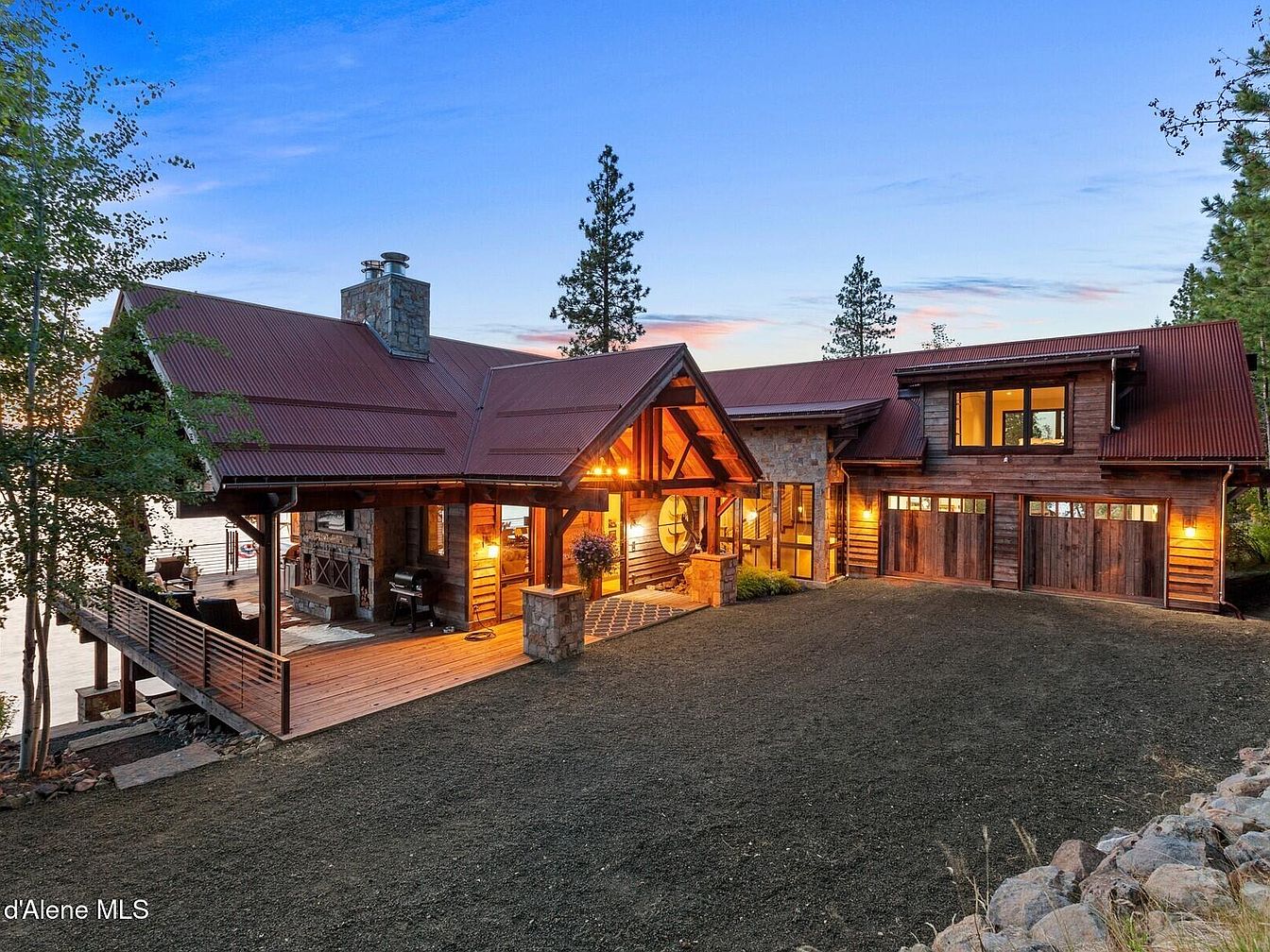 Experience Skyfall Ranch, an exquisite example of rustic modern architecture located in the serene town of Harrison, Idaho. Built in 2017, this luxurious residence spans over 5,000 square feet and is situated on a sprawling 10.2-acre waterfront plot with 437 feet of pristine, deep, and crystal-clear shoreline on Lake Coeur d’Alene. The home boasts a harmonious blend of natural materials including reclaimed wood, Montana stone, and exposed beams, which foster a tranquil and timeless atmosphere throughout the interior and exterior spaces. Fully furnished and turnkey, the 4-bedroom home features en-suite accommodations complemented by a bonus bunk room and lower recreational area, providing versatile living options for family and guests. The expansive wraparound decks offer breathtaking western views, perfect for peaceful mornings and stunning sunsets. Listed at $7,195,000, Skyfall Ranch presents a rare opportunity to own a private lakeside sanctuary that balances seclusion with proximity to the charming communities of Harrison and downtown Coeur d’Alene.
