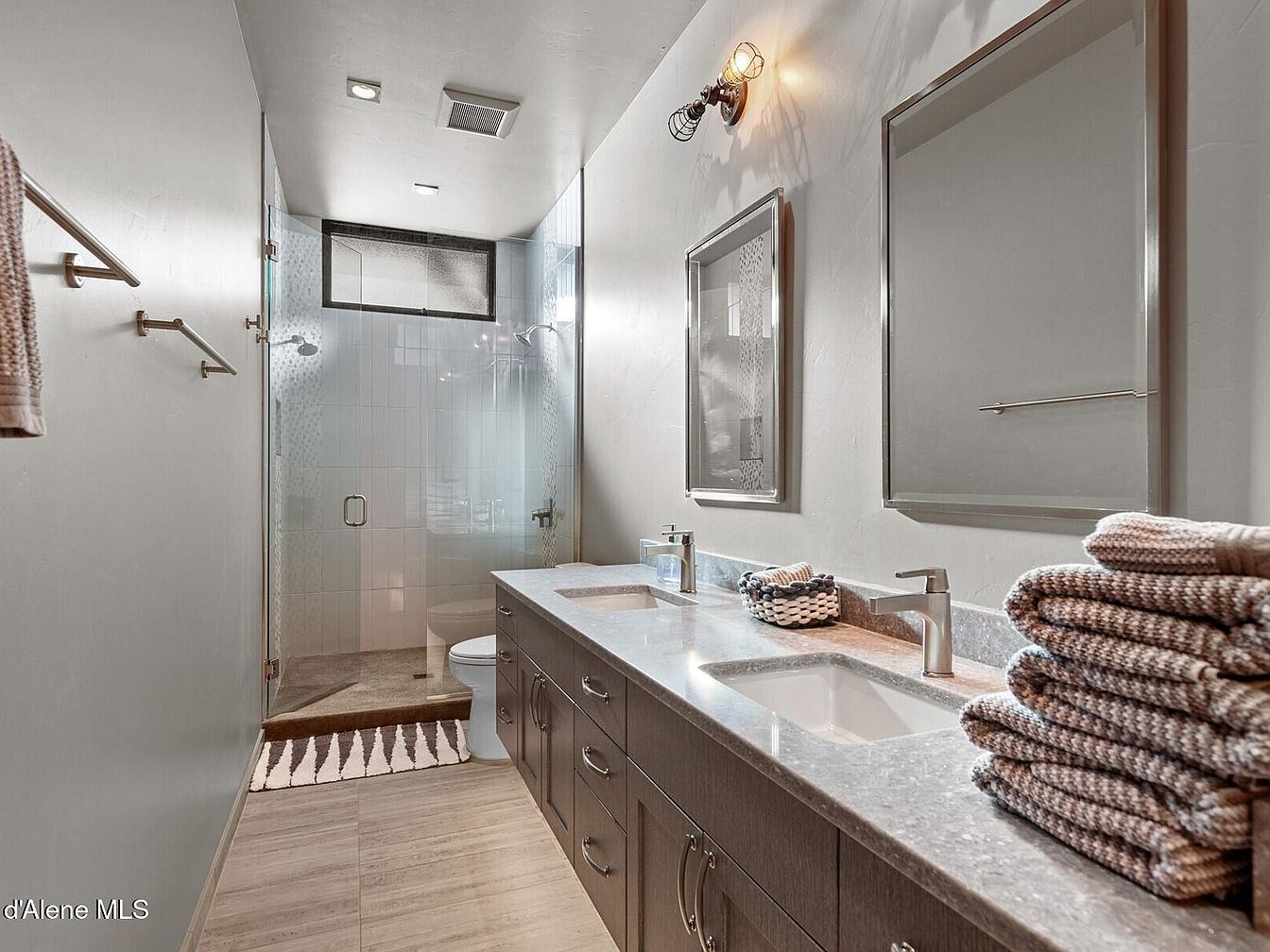 This bathroom features a sleek, double-sink vanity with a smooth gray stone countertop and contemporary chrome faucets. The cabinetry beneath offers ample storage, finished in a muted wood tone that complements the light wood-look flooring. Two simple, rectangular mirrors with thin metallic frames hang above each sink, enhancing the clean and minimalist aesthetic. Soft, neutral wall colors create a calm atmosphere, while a single industrial-style wall light fixture adds warmth through its exposed bulb. Towels in earthy, knitted textures are neatly stacked, while a glass-enclosed shower with white tiles and a subtle pattern completes the modern yet cozy design.