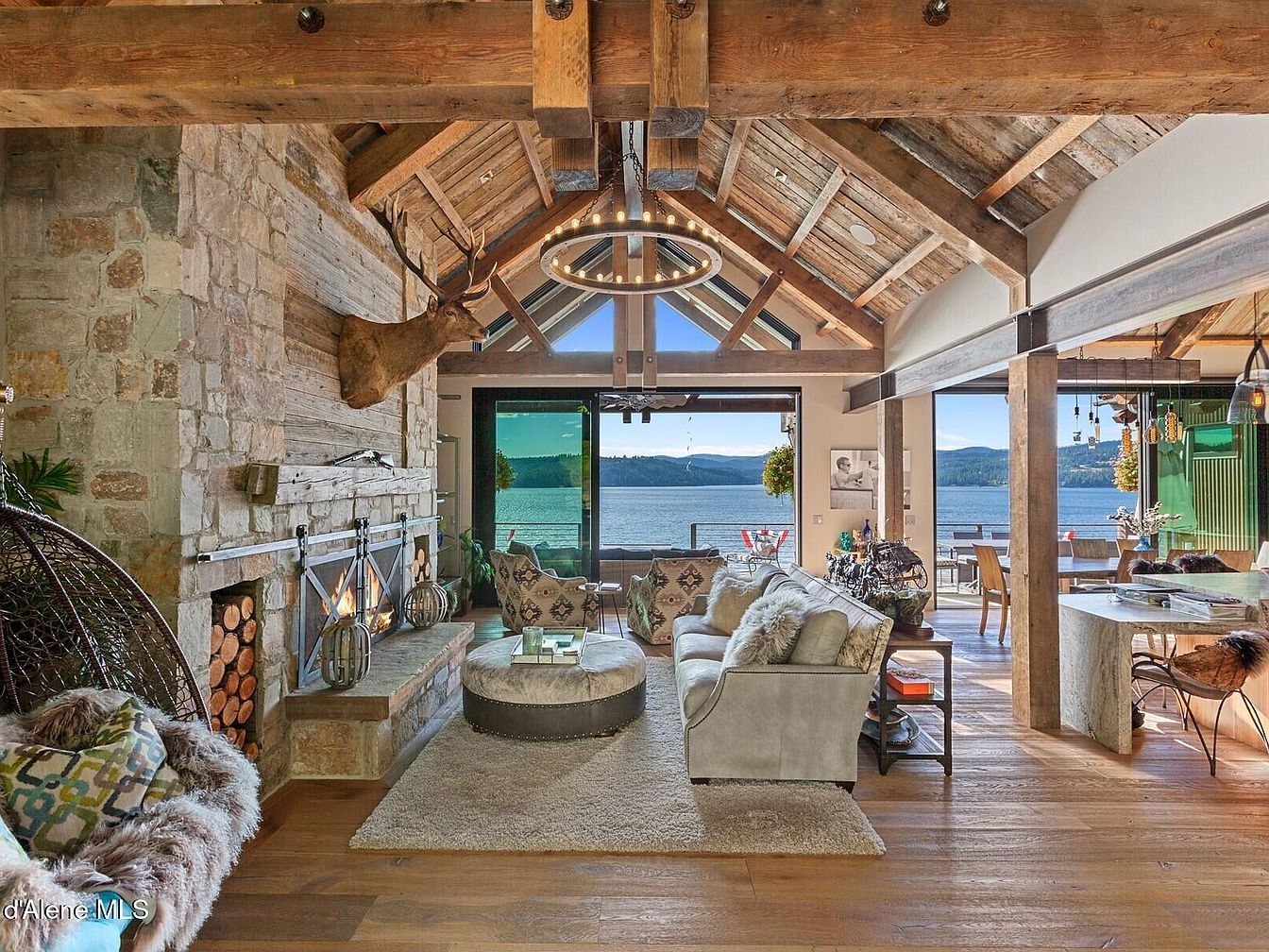 This living room blends rustic charm with modern comfort, featuring exposed wooden beams and a vaulted ceiling that draws the eye upward. A grand stone fireplace with a mounted elk head anchors the space, evoking a cozy cabin ambiance. Plush, neutral-toned furniture arranged on a soft shag rug creates an inviting seating area, complemented by a large round ottoman. Floor-to-ceiling glass doors open to reveal stunning lake views and an outdoor dining area, seamlessly connecting indoor living with nature. Warm wood floors and subtle decorative accents add to the space’s earthy yet refined aesthetic.