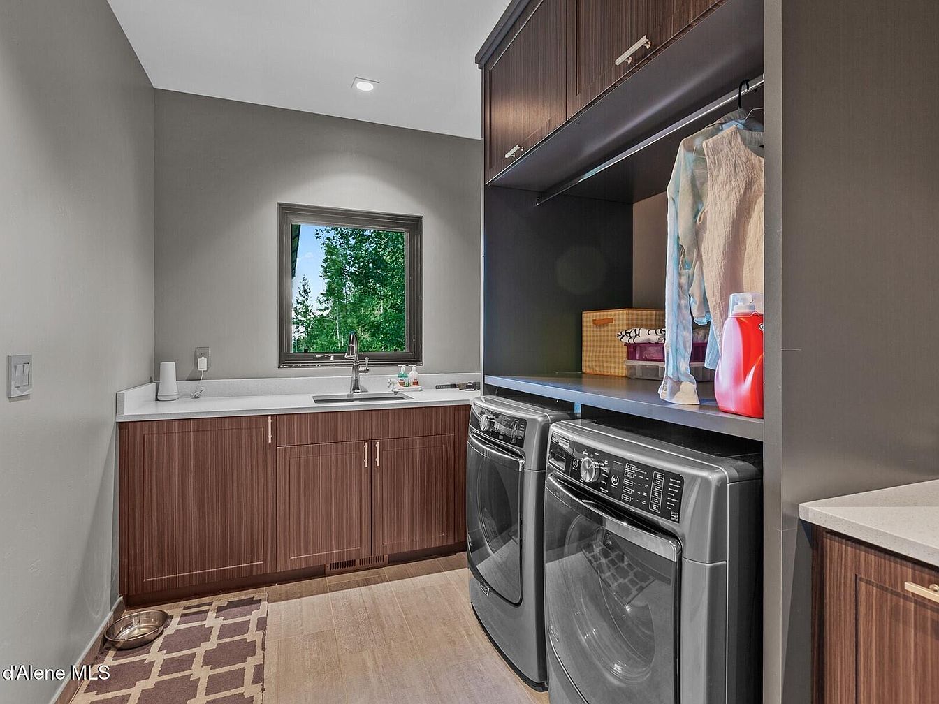 This laundry room features a practical and modern layout with sleek finishes. Dark wood cabinetry with subtle vertical grain lines provides ample storage, complemented by brushed metal handles. A washing machine and dryer, both in glossy black, sit side-by-side under open shelving, which is used for drying clothes and storing laundry essentials. A quartz countertop extends over the washer/dryer and along the opposite wall, incorporating a stainless steel sink placed under a window that offers natural light and views of greenery outside. The walls are painted soft gray, contrasting with warm beige tile flooring and a patterned area rug that adds texture and comfort to the space.