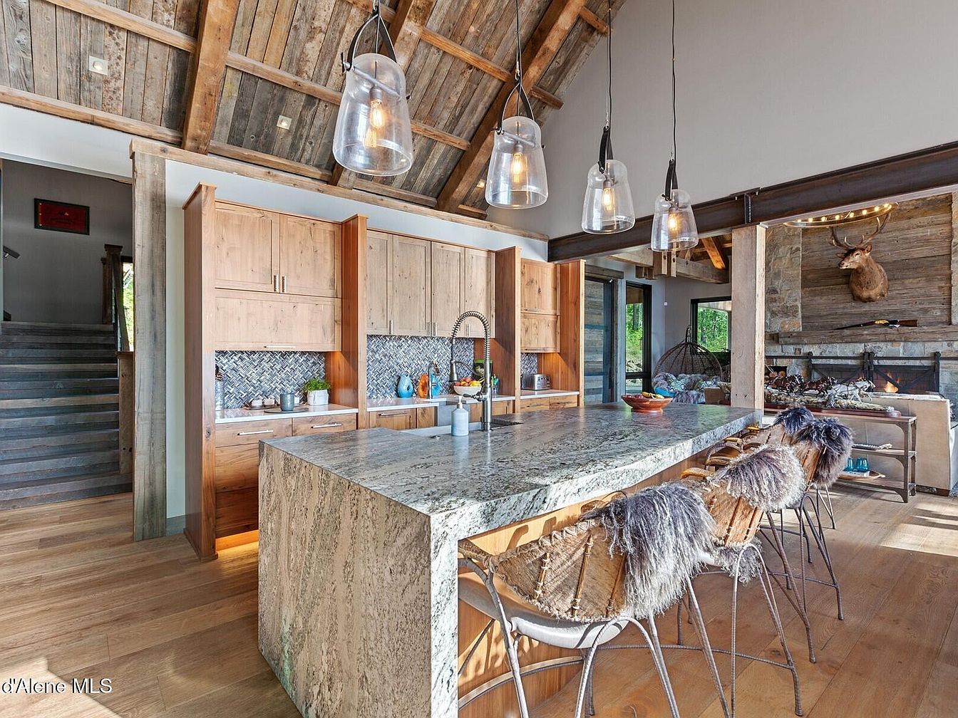 This expansive kitchen features a large natural stone island with a modern, high-arc faucet and seating for four on wrought iron stools draped with cozy faux fur throws. The surrounding cabinetry is crafted from light-toned wood, complementing the warm wooden floor and adding rustic charm. A textured mosaic tile backsplash introduces subtle patterning. Above, four industrial glass pendant lights hang from an open, vaulted ceiling lined with aged wooden planks and exposed beams, creating a striking contrast. Beyond the kitchen lies a living space with a stone fireplace and mounted elk head, perfectly blending rustic lodge aesthetics with contemporary comfort.