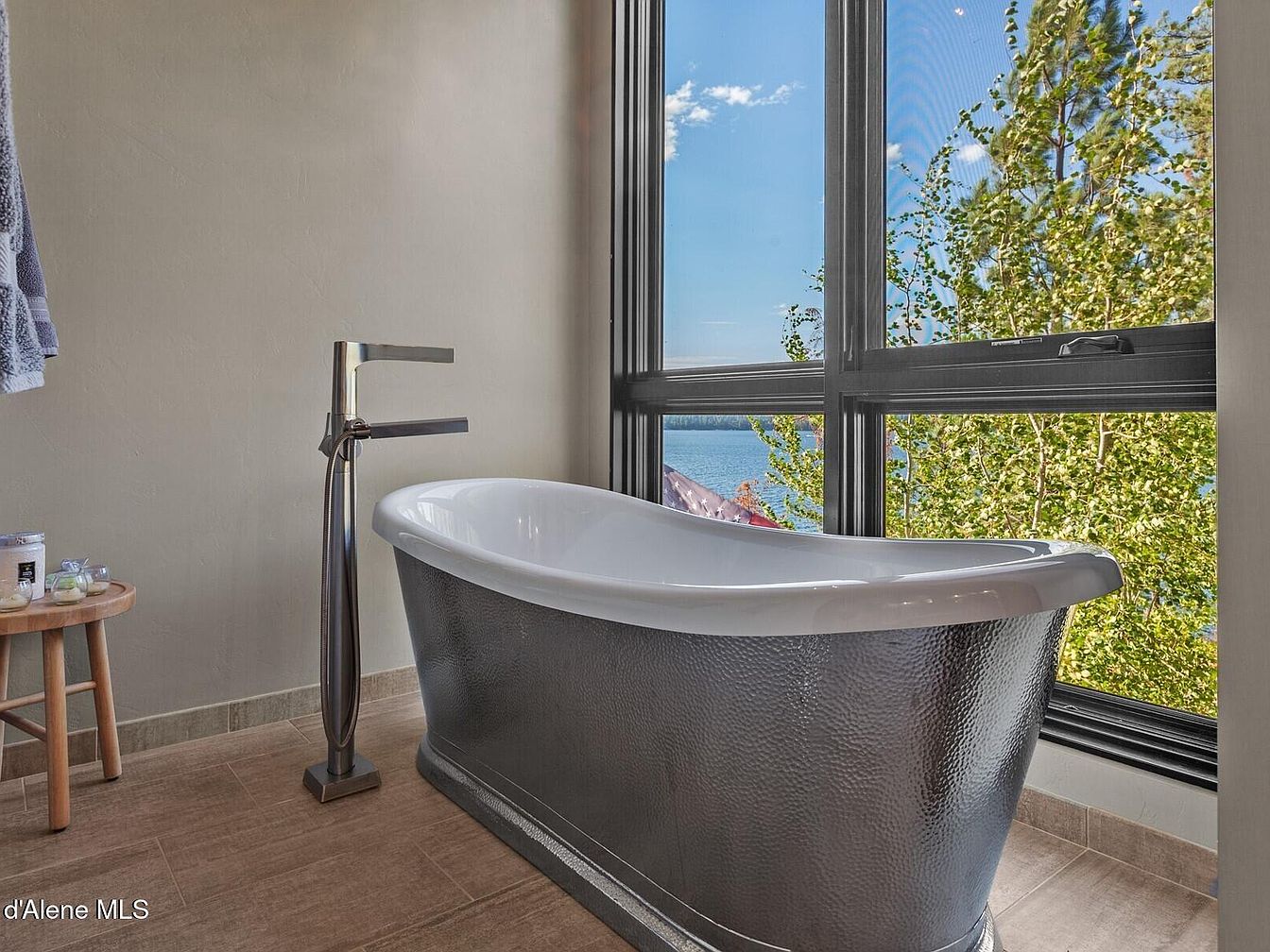This serene bathroom corner centers around a stunning freestanding bathtub with a textured metallic exterior and a glossy white interior. Positioned near large windows, the space offers an inviting view of lush green trees and tranquil lake waters beyond, blending natural beauty with indoor relaxation. The floor features warm-toned tiles adding subtle earthiness, while matte beige walls provide a neutral backdrop that enhances the modern, sleek design of the brushed metal faucet and hand shower fixture. A small wooden stool nearby holds bath accessories, completing this elegant and peaceful bathing retreat.