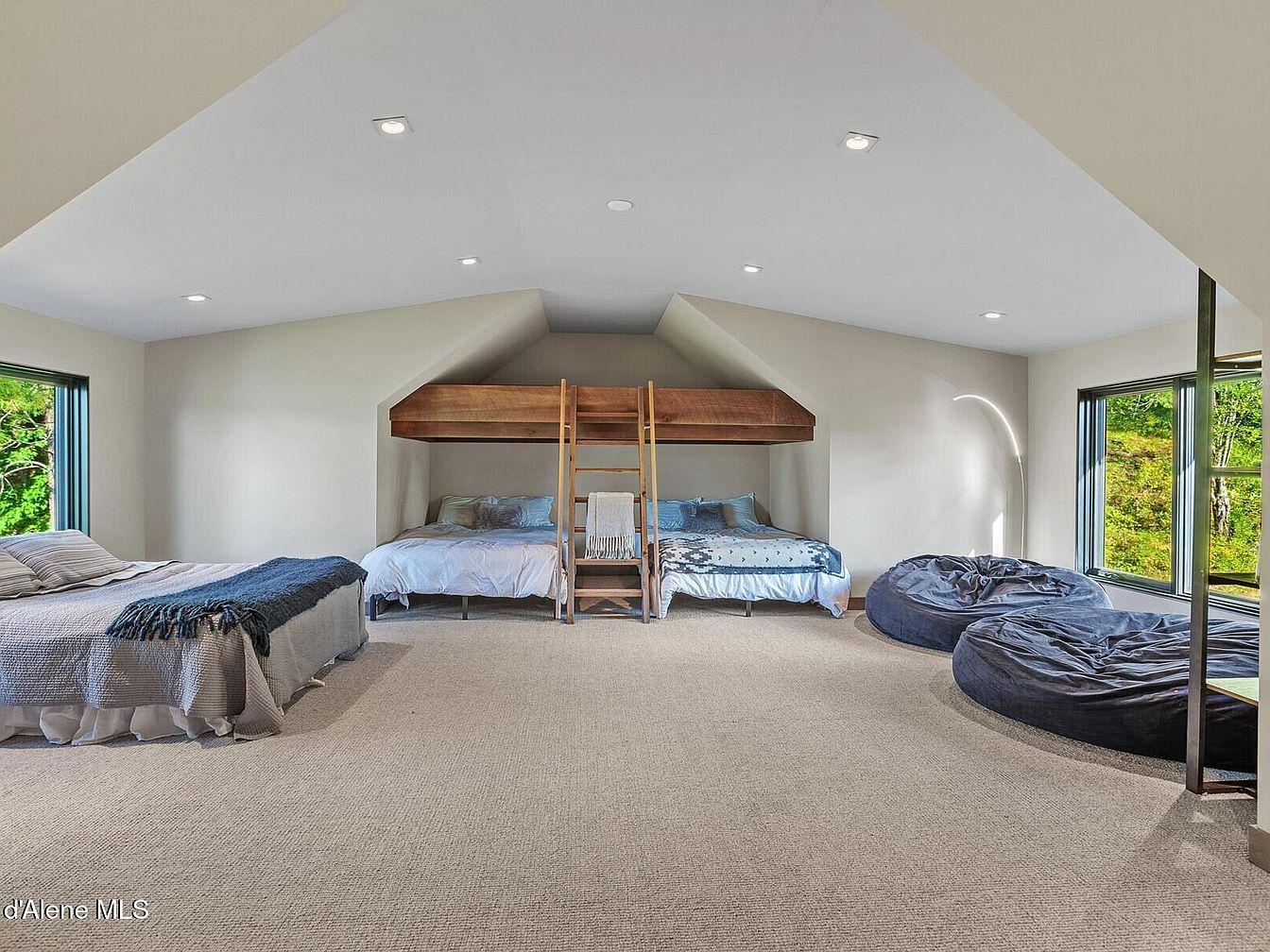 This loft-style bedroom area features a sloped ceiling enhancing the cozy yet spacious feeling. Two beds are nestled against the far wall, framed by a wooden loft platform accessed via a small ladder, adding a playful architectural touch. Neutral creams and soft grays dominate, promoting calm and relaxation. To the left, a single bed is adorned with a gray quilt and dark throw, while on the right, two large charcoal bean bags offer comfortable lounging by large windows that invite abundant natural light and verdant outdoor views. Recessed lighting ensures the room is well-lit in the evening.