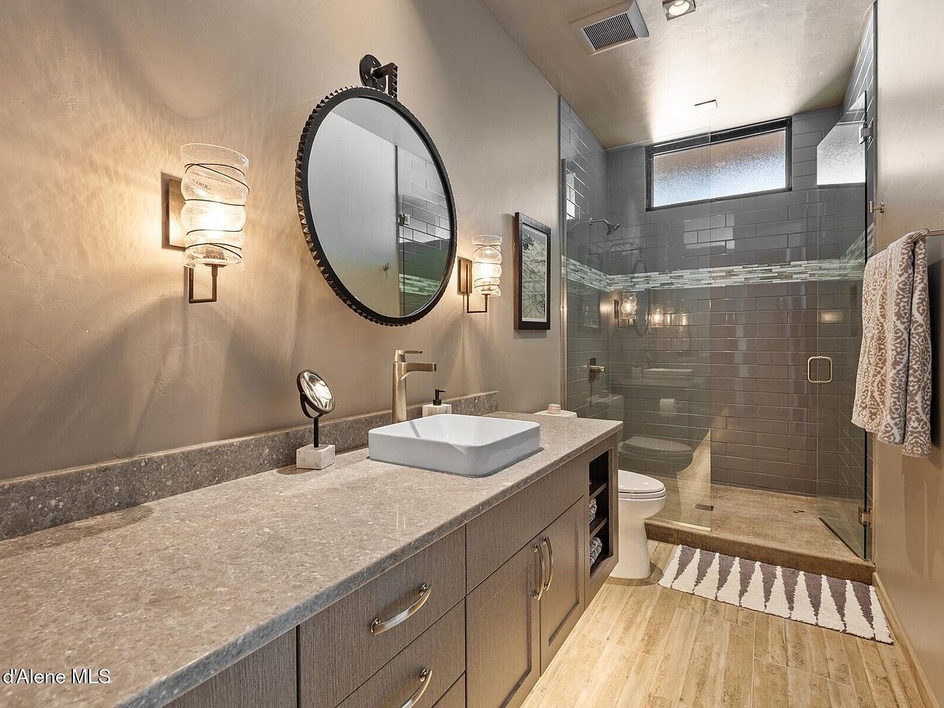 This bathroom features a sleek, contemporary design with a neutral color palette of soft grays and beige tones. The vanity has a long, polished stone countertop paired with dark wooden cabinetry providing ample storage. Above it, a round black-framed mirror is flanked by two elegant, sculptural wall sconces emitting warm ambient light. The walk-in shower has glossy gray subway tiles accented with a decorative horizontal mosaic stripe, enclosed by clear glass doors. Light wood-look flooring adds warmth, while a patterned rug softens the space near the shower entry. The overall aesthetic is modern, clean, and inviting.