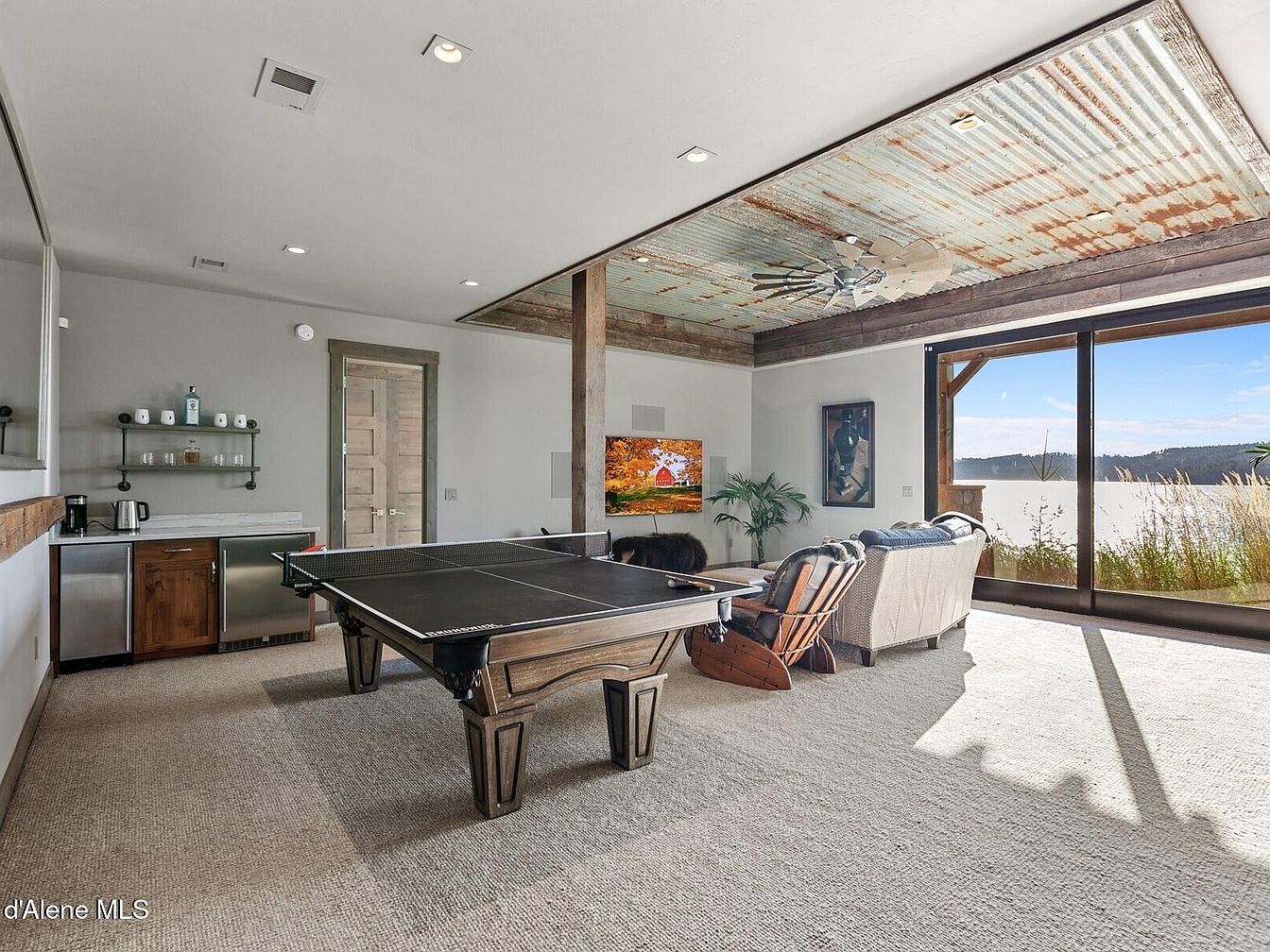 This spacious recreation room is designed to balance entertainment and relaxation with a rustic modern vibe. A central black ping pong table with wooden legs anchors the room, surrounded by a cozy seating area featuring cushioned armchairs and a textured beige sofa facing a mounted television. The ceiling captures attention with distressed corrugated metal inset bordered by reclaimed wood beams, adding industrial character. Neutral tones dominate the space: soft grays and warm wood accents create an inviting atmosphere. Large sliding glass doors flood the room with natural light and offer stunning lake views, extending the indoor-outdoor connection. A small wet bar with stainless steel appliances and open shelving enhances convenience without disrupting the airy layout.