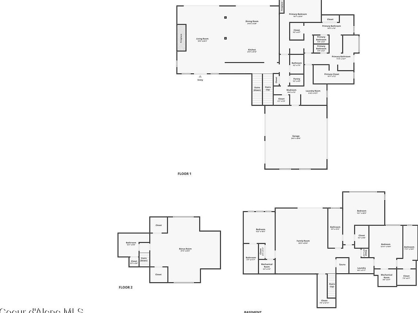 The floor plan reveals a spacious, multi-level home with a thoughtfully designed layout. The main floor includes an expansive open-concept living, dining, and kitchen area, optimized for both comfort and entertaining, complemented by a fireplace as a focal feature. The primary suite offers multiple closets and an en-suite bathroom, emphasizing privacy and luxury. Functional spaces such as a mudroom, laundry room, pantry, and garage are strategically placed nearby. The basement features a large family room, multiple bedrooms, bathrooms, and mechanical rooms, alongside a sauna for relaxation. Upstairs, a versatile bonus room with closets and a bathroom provides flexible living space. This home balances utility and comfort with clean, modern architectural flow.