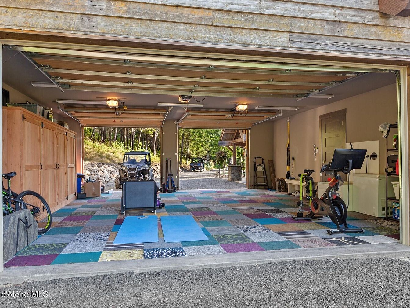 This spacious dual garage combines practical vehicle storage with a dedicated home gym area. The floor is adorned with a vibrant patchwork rug featuring a variety of teal, purple, blue, beige, and white tones, lending a lively touch to the otherwise utilitarian space. To the right, modern workout equipment including a stationary bike and yoga mats create an inviting exercise corner. Natural wooden cabinets along the left wall offer ample storage. The garages open fully to a lush outdoor setting, infusing the space with natural light. The neutral walls and simple ceiling lights balance functionality with subtle coziness.