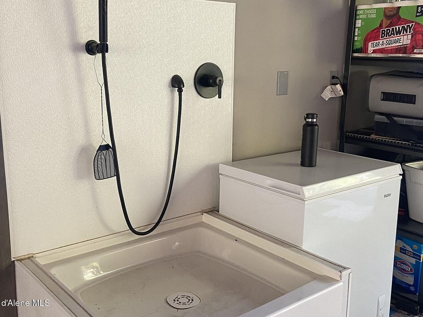 This compact laundry space features a deep, white utility sink with a matte black wall-mounted faucet and handheld sprayer, providing practical washing functionality. Positioned beside the sink is a white Haier chest freezer, topped with a sleek black water bottle that complements the faucet’s hardware. Neutral gray walls create a calm backdrop, enhancing the modern minimalist style. A black storage rack in the corner contains household essentials like paper towels and cleaning supplies, optimizing vertical space efficiently. The design balances utility and clean lines to maintain a tidy, purposeful workspace in this convenient laundry area.