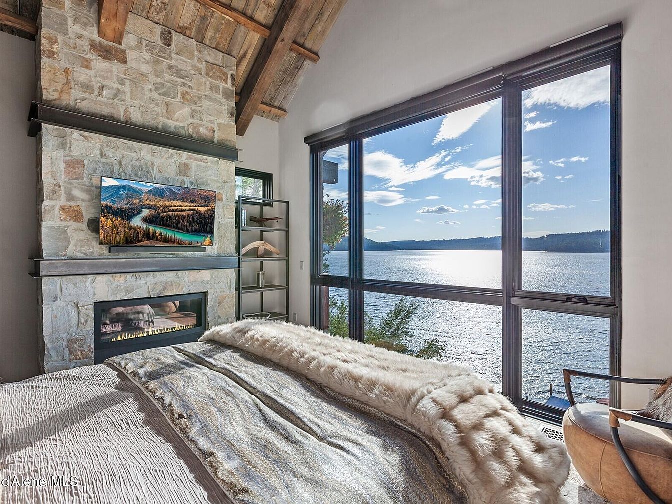 This cozy bedroom features a rustic yet refined design anchored by a towering stone fireplace and exposed wooden beams set against a vaulted ceiling. The fireplace, framed by a metal mantel and topped with a wall-mounted flat-screen TV, adds warmth and texture. Floor-to-ceiling windows provide an expansive view of a shimmering lake under a bright sky, flooding the room with natural light. The bed is layered with neutral-toned linens and a plush fur throw, creating an inviting space. A modern metal and wood shelving unit and a cushioned accent chair complete the room’s balance of comfort and rustic elegance.