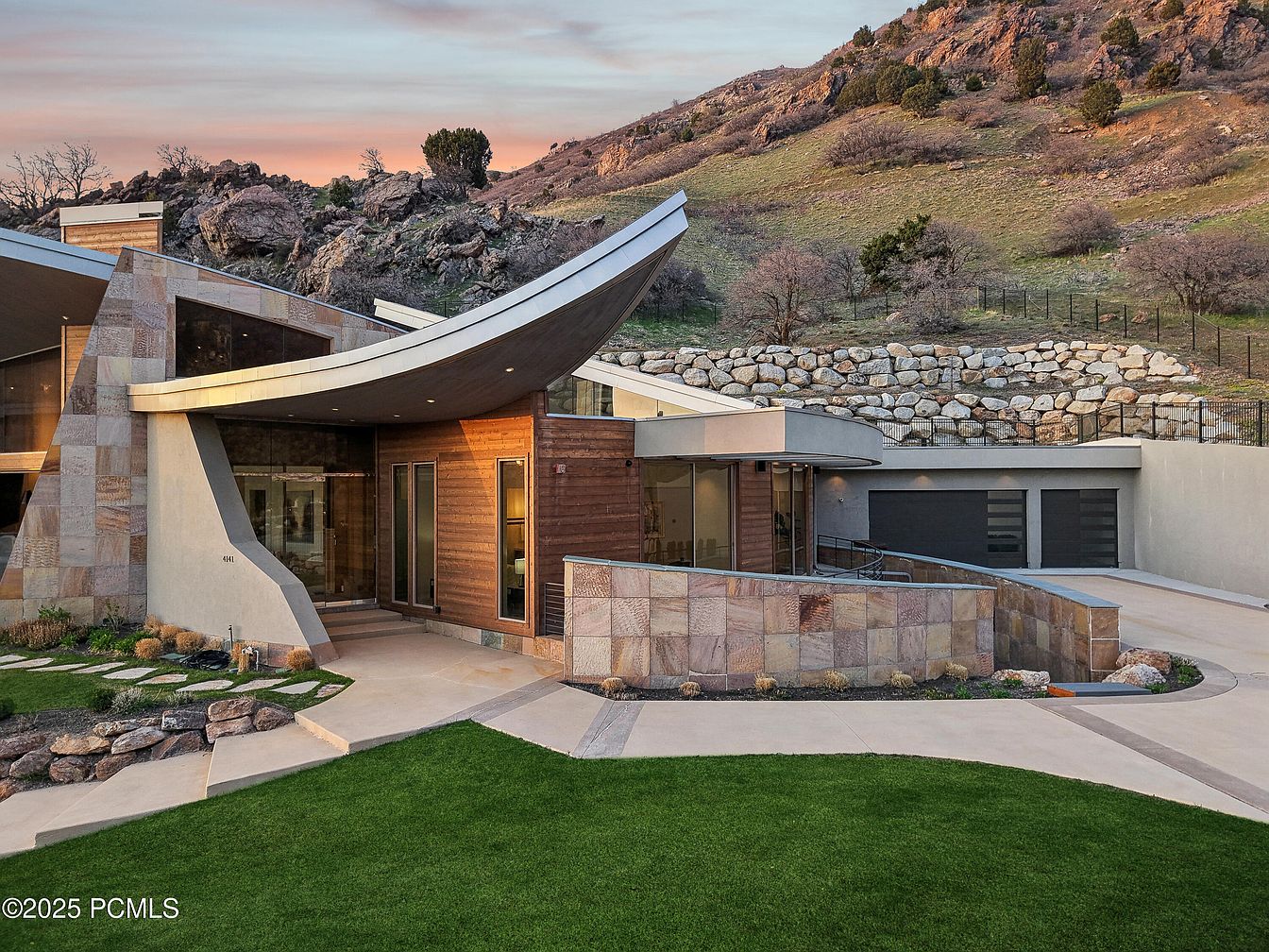 This entrance showcases striking modern architectural design with a dramatic curved roof that appears to float above the doorway. The exterior blends wood paneling with natural stone tiles, creating a harmonious balance between organic and contemporary materials. Large glass panels let natural light flood inside, while the layered stone retaining wall and lush green lawn enhance the home’s connection to its rugged hillside surroundings. A spacious driveway leads to a double garage with sleek dark doors, emphasizing clean lines and a sophisticated yet inviting aesthetic.