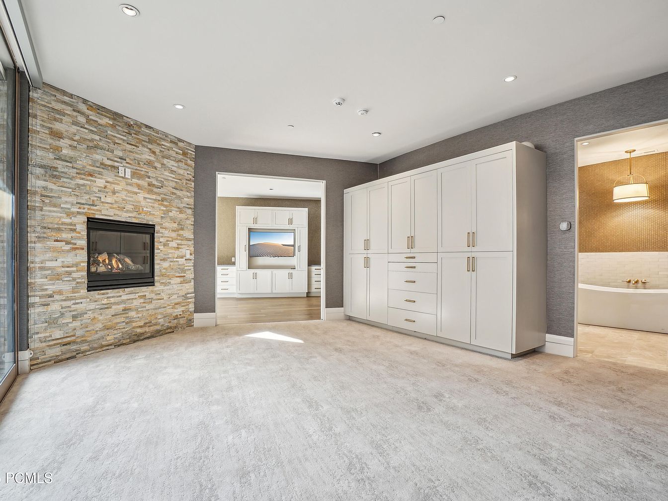 This serene sitting area within the master bedroom boasts a soft, neutral palette with light grey carpeting and textured grey walls. A modern stone accent wall featuring a built-in gas fireplace offers warmth and a natural element. Spacious white cabinetry with sleek brass hardware provides ample storage and contrasts beautifully against the darker walls. The room offers seamless flow into an adjacent bathroom, highlighted by warm lighting and sophisticated fixtures. Beyond the sitting area, a bright adjoining space with white built-ins and a mounted TV adds a functional and stylish dimension to this private retreat.
