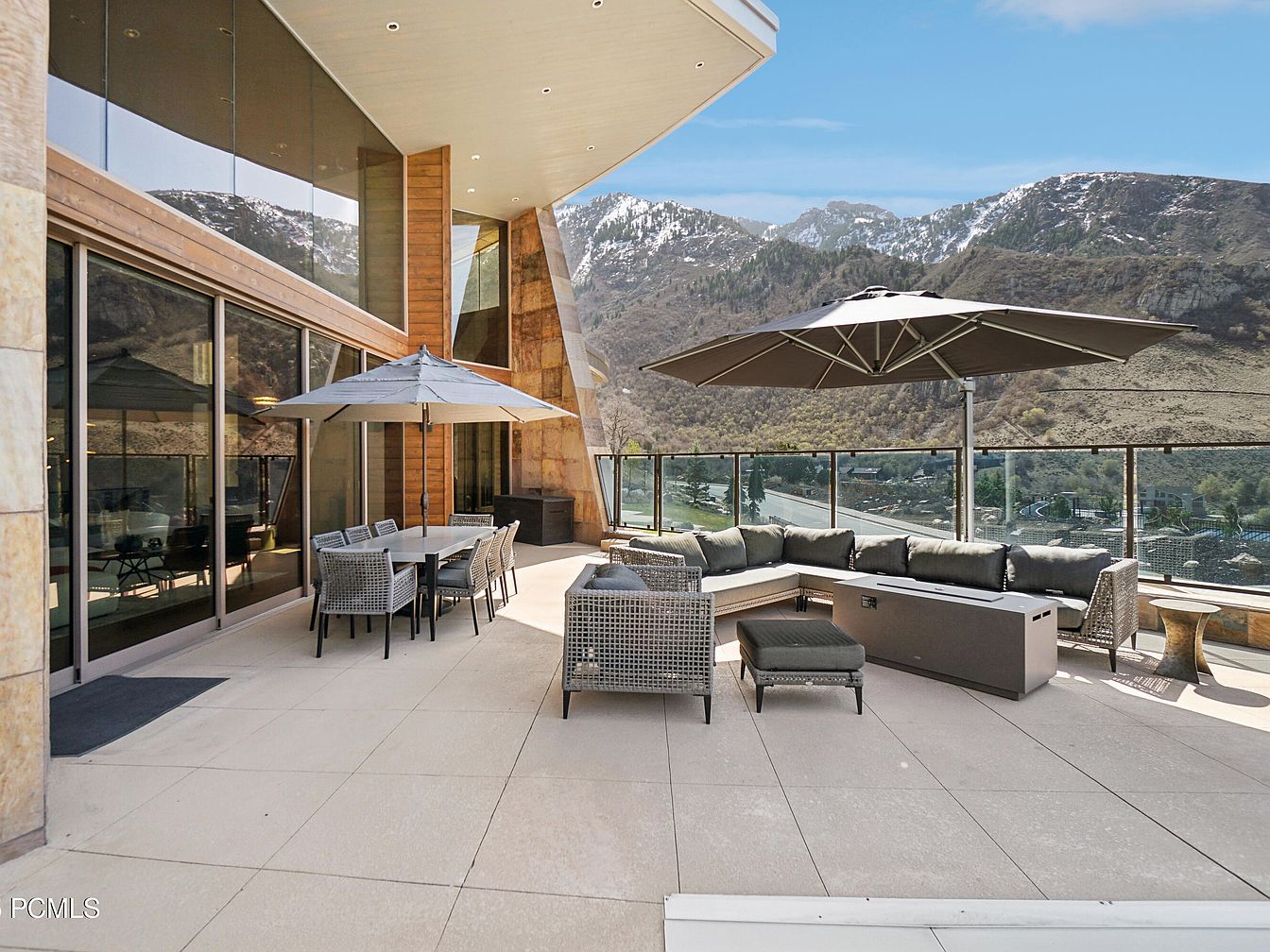 This expansive outdoor patio overlooks rugged, snow-capped mountains, providing a breathtaking natural backdrop. The area features sleek, light-colored tile flooring that complements the warm wood and stone architectural accents on the home’s exterior wall. Against the glass and wood facade, a modern outdoor dining set with eight woven chairs surrounds a rectangular table shaded by a large umbrella, perfect for al fresco meals. Adjacent sits a spacious gray sectional sofa paired with matching armchairs and a rectangular coffee table, shaded by a wide umbrella, creating a comfortable lounge zone ideal for relaxing and entertaining with panoramic hillside views.