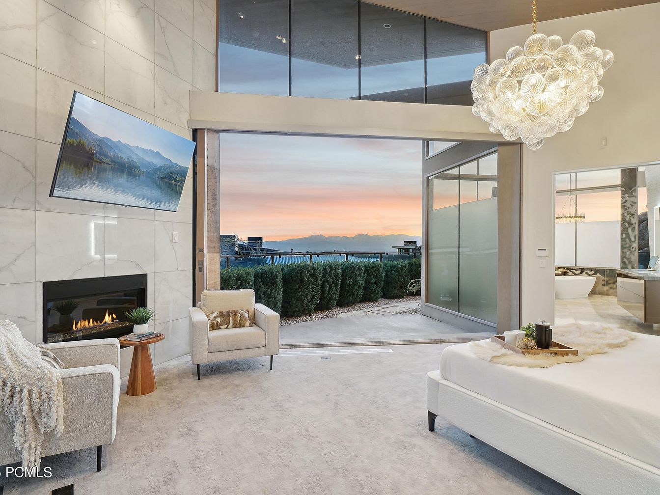 This spacious master bedroom showcases floor-to-ceiling glass walls that offer stunning panoramic views of the mountainous landscape and an inviting outdoor pool area. The room’s design embraces natural light and scenic beauty, blending indoor comfort with outdoor splendor. Soft neutral tones dominate, with a plush carpet underfoot and light wood ceilings adding warmth. The bed is dressed in crisp white linens, complemented by a mix of beige and brown accent pillows. A modern fireplace and two armchairs create a cozy sitting nook, while the contemporary bubble chandelier adds an artistic focal point, enhancing the luxurious yet serene atmosphere.
