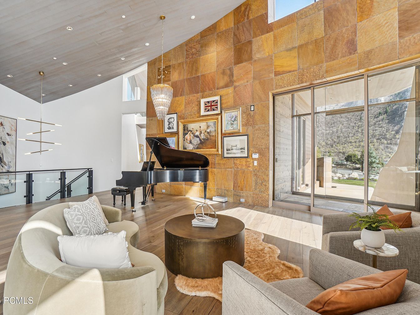 This living room boasts a modern and open layout with a striking high ceiling that enhances the spaciousness. A prominent feature wall clad in warm, textured earth-toned tiles complements the natural wood flooring and ceiling, creating a cohesive and inviting atmosphere. The furniture arrangement centers around a curved beige velvet sofa and two gray armchairs adorned with rust-orange pillows, adding subtle color warmth. A round, bronze-toned coffee table sits atop a soft, tan fur rug. A sleek black grand piano stands against the accent wall, flanked by an eclectic gallery of framed art. Expansive glass sliding doors invite scenic mountain views and natural light, seamlessly connecting indoor and outdoor living.