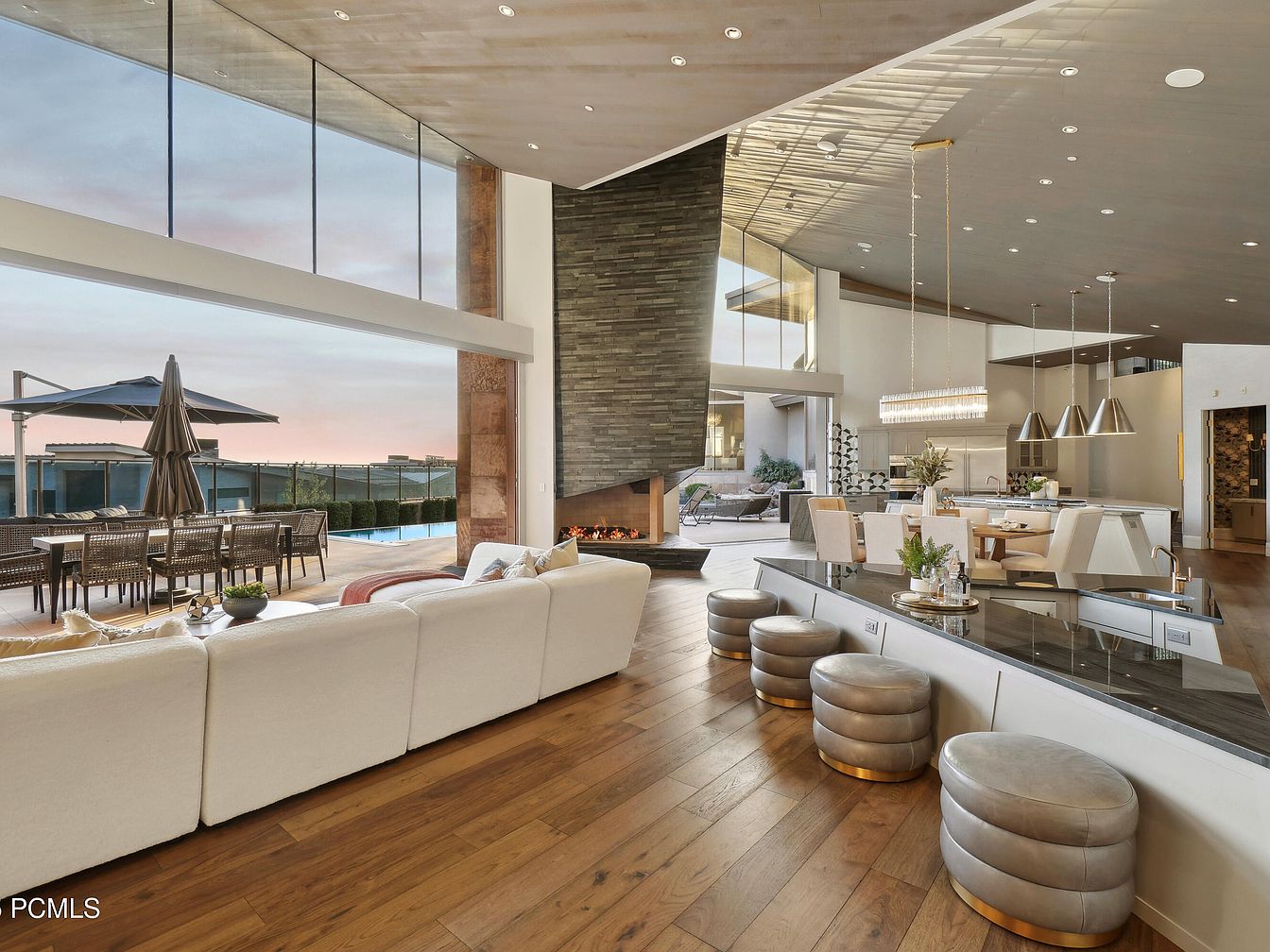 This spacious living area seamlessly blends indoor comfort with outdoor beauty through expansive floor-to-ceiling glass walls, providing stunning views and natural light. The room’s centerpiece is a dramatic angled fireplace clad in stacked stone, adding architectural interest and warmth. Warm wood flooring enhances the room’s inviting atmosphere. The kitchen area includes a sleek island with a dark countertop and round, cushioned bar stools with brass accents for casual dining. A formal dining area with beige upholstered chairs sits beyond, illuminated by sophisticated pendant lighting and a modern chandelier, fostering a stylish yet comfortable environment.