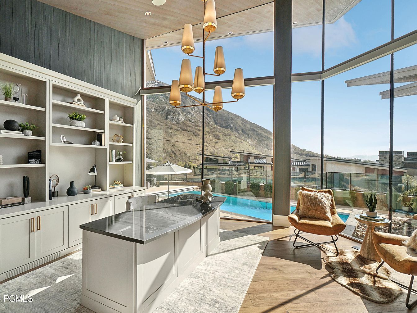 This sophisticated home office features a stunning floor-to-ceiling glass wall, offering expansive views of the pool area and surrounding mountainous landscape, blending indoor and outdoor environments seamlessly. The room is anchored by a large island desk with a polished dark marble countertop and soft white cabinetry, accented with brass hardware. A built-in shelving unit spans one wall, displaying curated decor and books, enhancing a stylish yet functional workspace. Warm wooden flooring and plush tufted chairs with furry throw pillows add texture and comfort, balanced by a contemporary chandelier emitting soft ambient light from above.