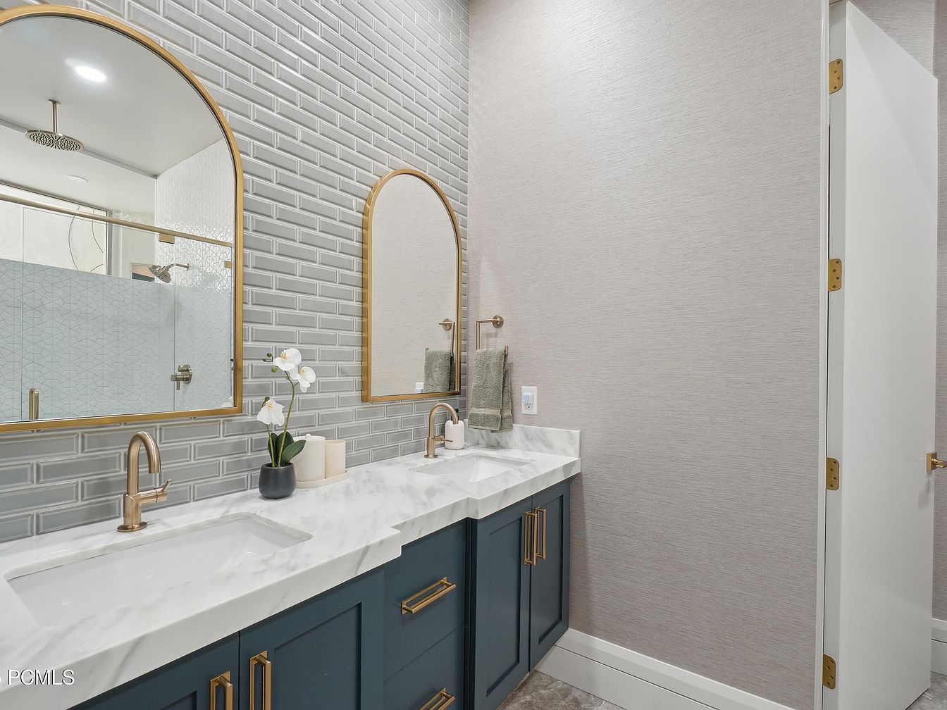 This bathroom features a double sink vanity with a luxurious marble countertop that extends along the deep blue cabinetry below. The cabinet hardware and faucets are finished in a warm brass tone that complements the arched mirrors framed in matching brass. The backsplash consists of glossy gray subway tiles arranged in a horizontal pattern, adding texture and subtle shine to the space. Soft, neutral wallpaper covers the adjacent wall, contrasting with the tile while maintaining a calm, sophisticated color palette. The corner includes an elegant orchid and neatly rolled towels, emphasizing clean, modern aesthetics and attention to detail.
