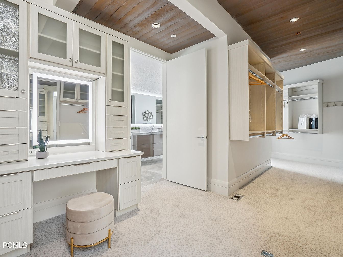 This expansive walk-in closet is designed with an emphasis on organization and serene elegance. White cabinetry with frosted glass fronts and multiple drawers lines one side, while open shelving and hanging rods provide ample storage space on the opposite wall. The soft leopard-print carpet enhances the comfort underfoot, tying the neutral palette together. A built-in vanity with backlit mirror offers a sophisticated grooming area, complemented by a plush round beige velvet stool with a gold base. The ceiling features warm-toned wooden panels with recessed lighting, adding texture and warmth to the bright, airy space. An adjoining bathroom can be seen through a partially open white door, maintaining the clean, modern aesthetic throughout.