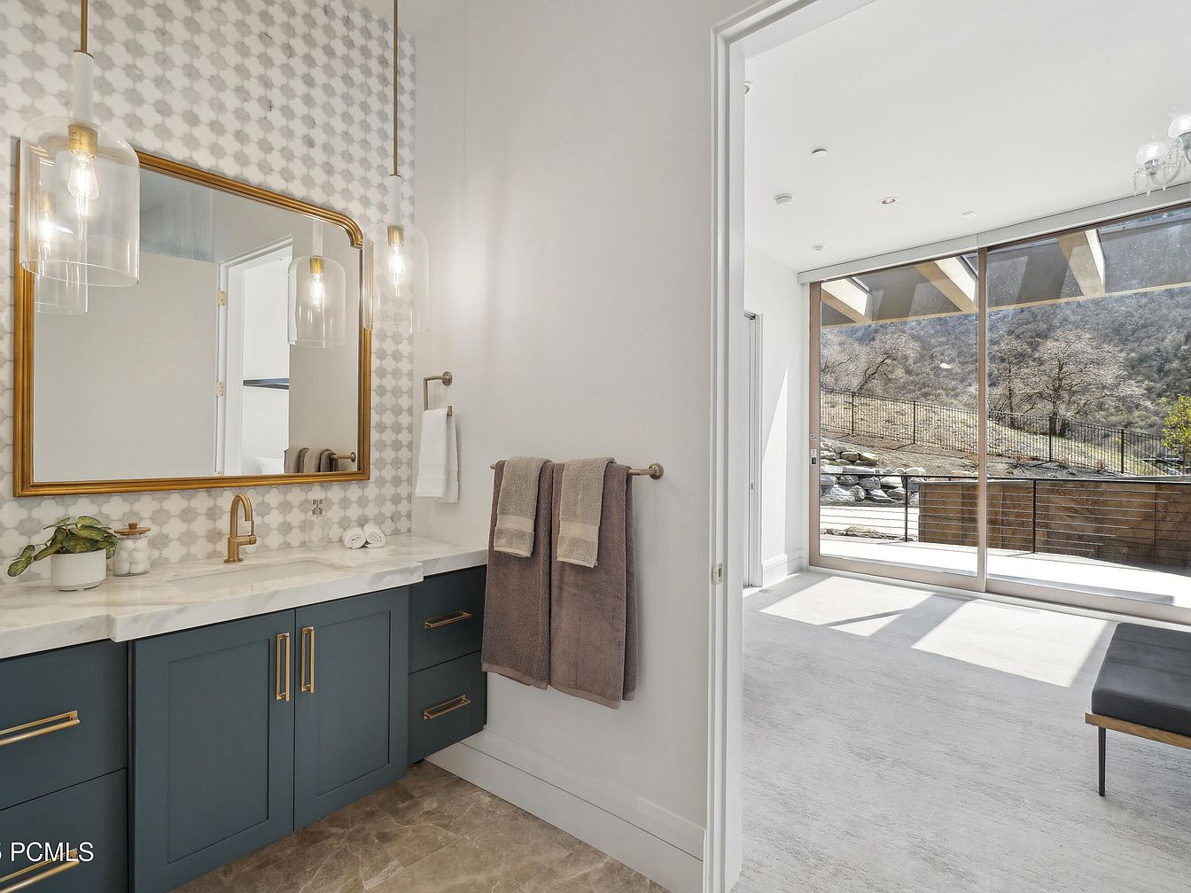 This bathroom features a modern vanity with deep blue cabinetry contrasted by gold handles that add a touch of luxury. The countertop is a smooth, white marble with subtle veining, complementing the geometric patterned backsplash tiles in soft neutral tones. Above the sink is a large gold-framed mirror flanked by two elegant glass pendant lights with brass accents, contributing to a warm, inviting glow. Plush towels in muted gray hang neatly on gold towel bars. Through the open doorway, natural light floods in from floor-to-ceiling windows overlooking a serene outdoor landscape, enhancing the bright and airy atmosphere.
