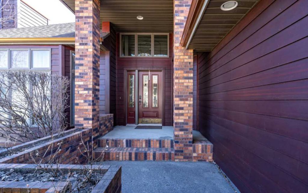 This striking front entry showcases a blend of modern and traditional architectural elements, with rich, contrasting textures of brick and wood that create a warm, welcoming ambiance. The beautifully detailed double doors with glass insets add an elegant touch, while the stone steps lead up to the entrance, enhancing the home’s curb appeal. The surrounding brickwork and sleek wood siding perfectly complement the design, offering a sophisticated and inviting first impression of the home.