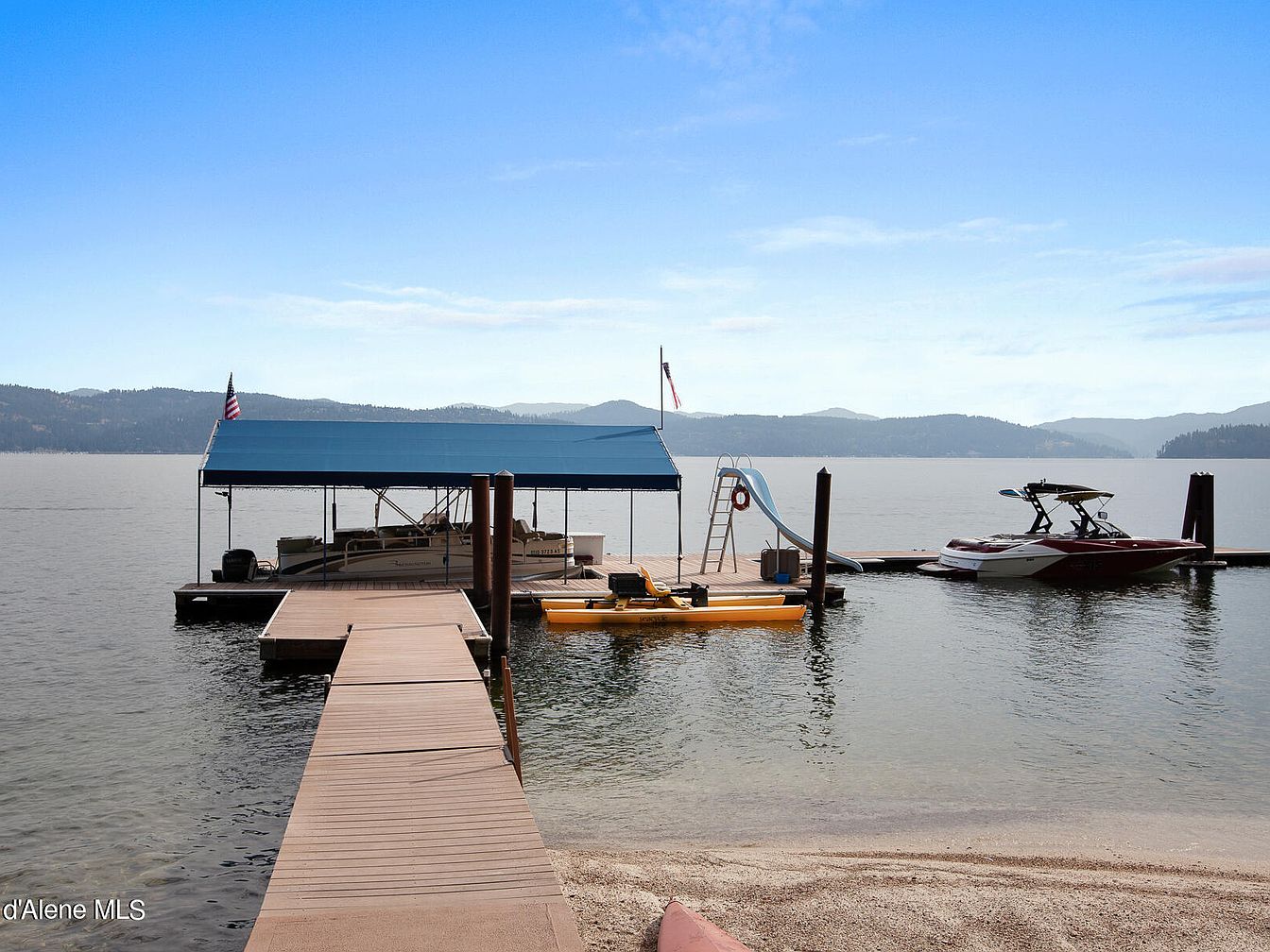 This peaceful lakeside dock features a wide wooden walkway extending over the calm water, leading to a covered boat slip with a classic pontoon boat. The dock is equipped with practical elements including a blue fabric canopy for shade and protection, and an attached slide providing fun water access. Nearby, a sleek red and white motorboat and a bright yellow paddleboat are moored, highlighting recreational options. The serene setting is framed by distant mountain ranges and a clear blue sky, offering an inviting blend of natural beauty and active outdoor lifestyle.