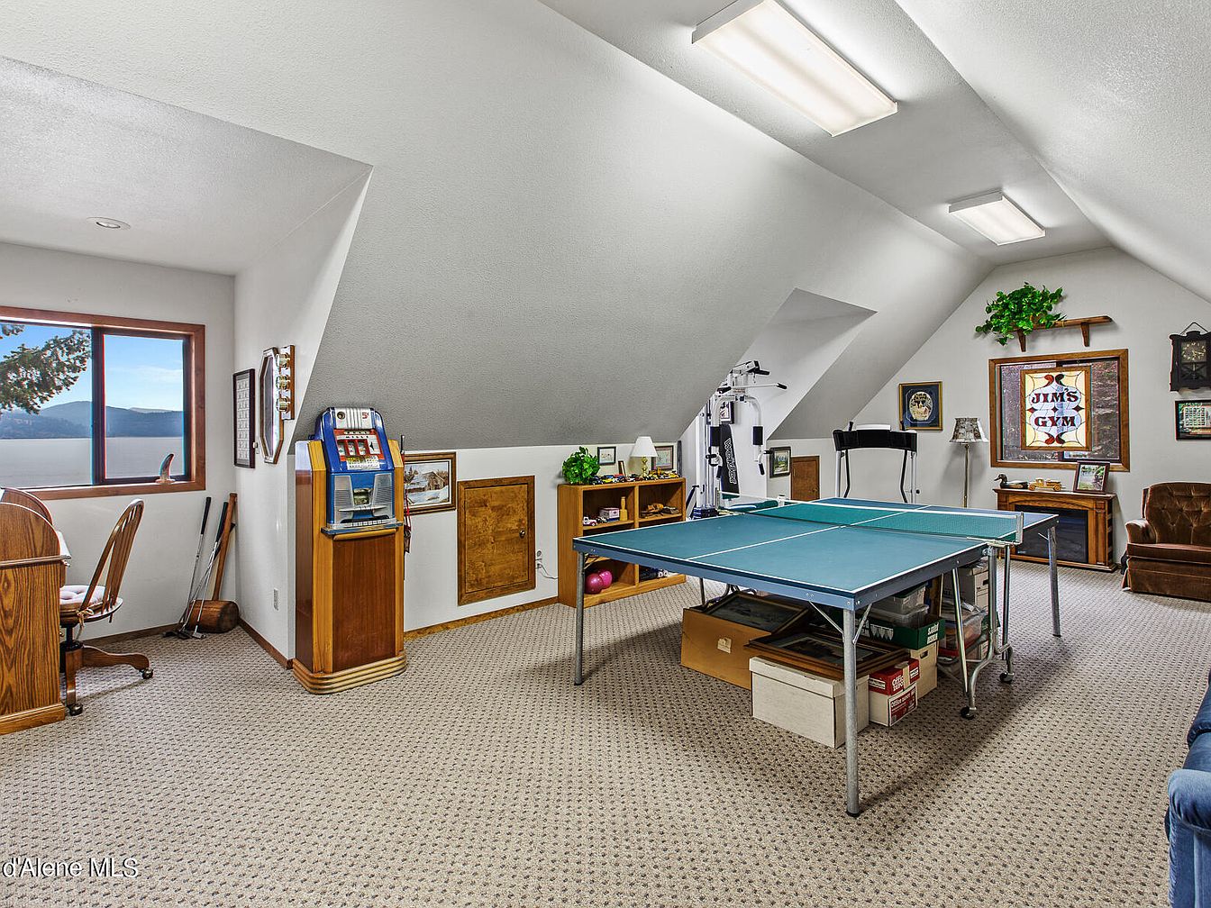 This spacious recreation room features a sloped ceiling with clean white walls and soft beige patterned carpet, creating a cozy yet open atmosphere. Natural light pours in from a large window with wood trim, complementing the wood accents seen throughout, including a vintage slot machine and wooden shelving. The center is dominated by a blue ping pong table, underneath which storage boxes are neatly tucked away. Recreational and fitness equipment like a treadmill and multi-gym station are positioned near the back, alongside a comfortable brown armchair and framed wall art, blending function with nostalgic charm.