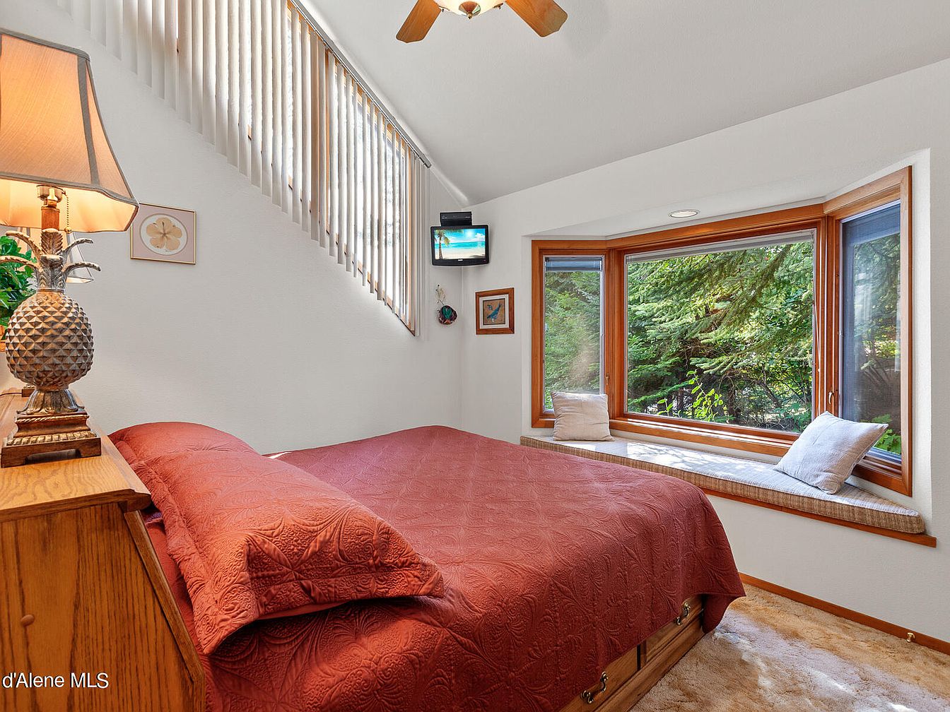 This bedroom exudes warmth with a rich rust-colored quilt covering the bed that is positioned against a white wall. A wooden nightstand holds a decorative pineapple-shaped lamp, adding a whimsical yet classic touch. The room features a unique angled window with vertical blinds, allowing natural light to softly filter in. A charming bay window nook with a cushioned bench invites relaxation while framing scenic views of lush green trees outside. The neutral-colored carpet complements the light walls, and a small wall-mounted television provides entertainment in this compact, inviting retreat.