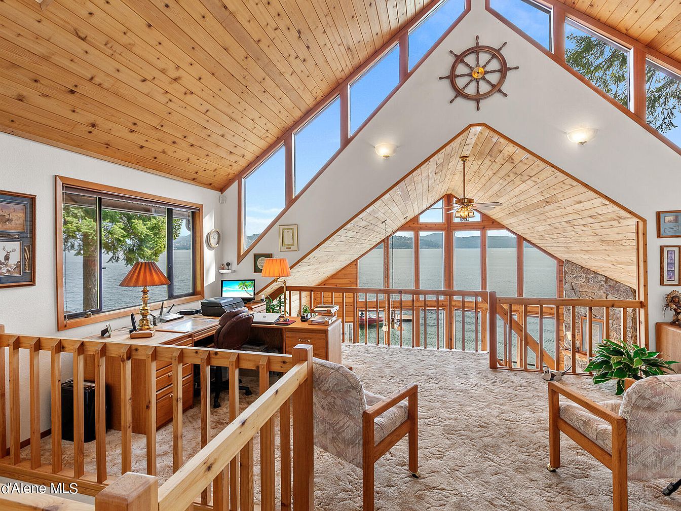 This loft space serves as both a cozy office and a sitting area, overlooking a stunning lake view. The vaulted ceiling features warm, light-toned wood paneling that extends down into an angled feature wall framing expansive triangular windows. These large windows flood the room with natural light and highlight serene water vistas. The decor includes natural wood furniture—a classic desk and matching wooden chairs with subtle patterned upholstery. Neutral beige carpeting complements the wood tones, while brass-accented lamps provide warm lighting. Nautical accents like the ship’s wheel on the wall add character, enhancing the lakefront retreat feel.