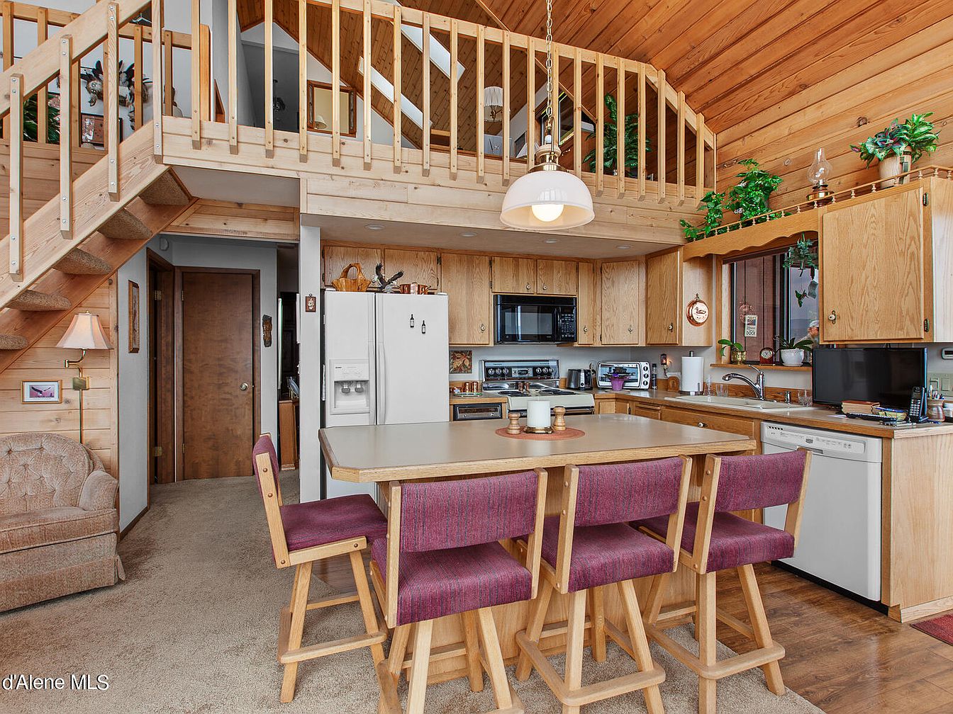 This cozy kitchen features a warm wood aesthetic with oak cabinetry and paneling that extends throughout the space, including the loft railing above. The kitchen island serves as a dining area with four cushioned stools upholstered in a deep burgundy fabric adding a pop of color. Above the island hangs a classic dome pendant light, providing focused illumination. Appliances include a white refrigerator, a black microwave, and a white dishwasher. Greenery placed atop cabinets adds freshness, while a small desk area with a TV and phone emphasizes functionality. The nearby carpeted floor and adjacent living area with an armchair enhance the inviting, rustic charm.