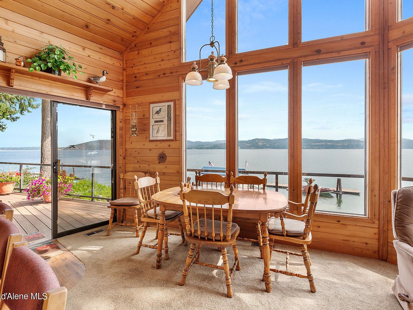 This cozy dining area features rich honey-toned wood paneling that extends across vaulted ceilings, enveloping the space in rustic warmth. A wooden dining table with six matching spindle-back chairs anchors the room, inviting communal meals with a stunning backdrop. Expansive floor-to-ceiling windows frame serene lake and mountain views, flooding the space with natural light. Adjacent sliding glass doors lead out to a deck adorned with colorful potted flowers, blending indoor and outdoor living. Soft beige carpeting adds comfort underfoot, while nature-inspired décor, including framed bird art and a plant on a wooden shelf, enhances the inviting cabin aesthetic.