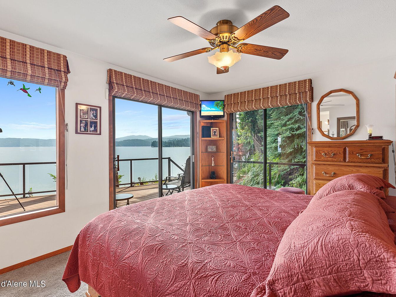 This serene bedroom offers expansive views of a tranquil lake and surrounding forest, visible through large sliding glass doors and windows. The room is anchored by a warm wood dresser with brass hardware and a matching octagonal mirror above it. A ceiling fan with wooden blades and a vintage light fixture adds classic charm. Soft, neutral walls complement the beige carpet, creating a cozy atmosphere. A richly textured, reddish-pink quilt and matching pillows dress the bed, harmonizing with the earthy tones of the wooden window trim and valances. The corner includes a small built-in wood shelving unit and a discreet wall-mounted TV, blending functionality with comfort.
