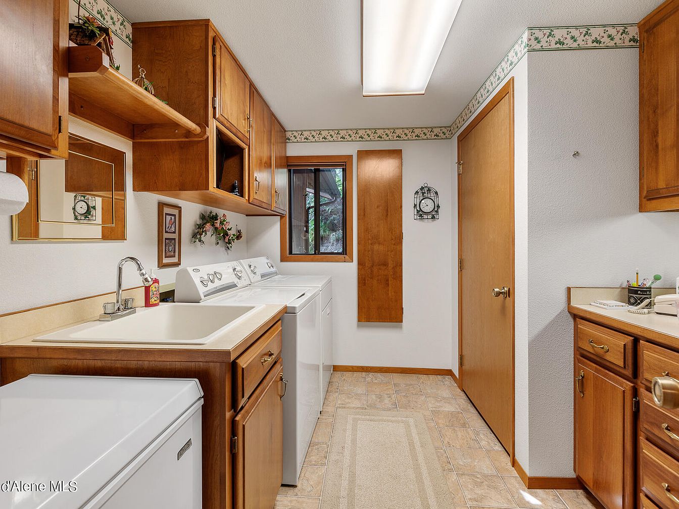 This laundry room combines practicality with warm, rustic charm. The space features ample wooden cabinetry in a medium oak finish, offering generous storage above and below the countertop. A white utility sink is integrated into the counter alongside a matching washer and dryer, emphasizing function. The floor is tiled in neutral tones with a centrally placed beige runner rug, complementing the wood finishes. Walls are painted white, topped with a floral border adding a subtle vintage touch. A small window brings natural light, brightening the room and offering a view outside. The overall atmosphere is homey and inviting.