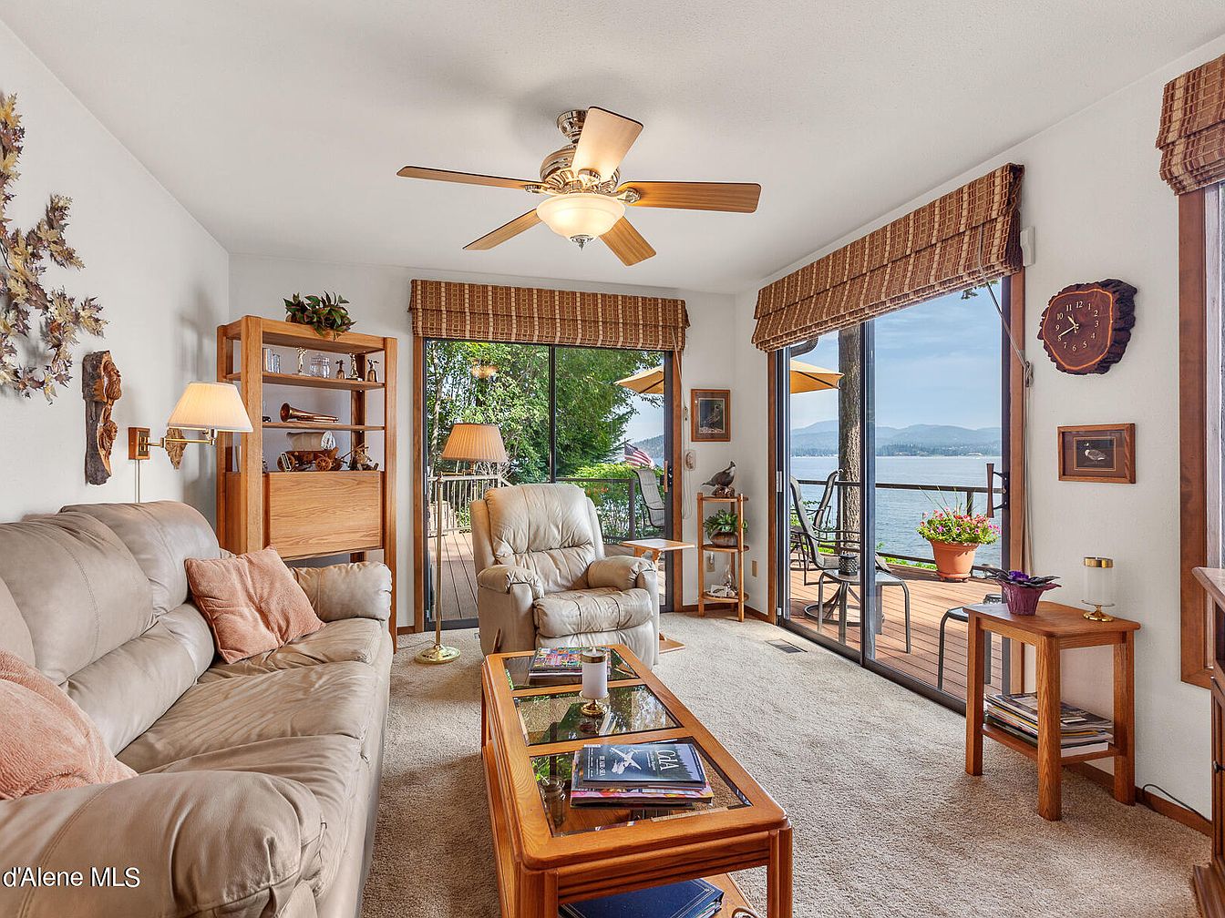 This inviting family room offers a warm, comfortable ambiance with plush beige leather seating, including a sofa and recliner. The charcoal beige carpet cushions footsteps underfoot, while natural wood accents in furniture and blinds add rustic charm. Sliding glass doors open to a serene lake view with a wooden deck outside, framed by tall trees and mountain vistas. The ceiling fan with light provides gentle airflow and illumination. Display shelves and small side tables enhance practicality without crowding the space. Soft lighting from wall-mounted lamps and a floor lamp completes the cozy, nature-inspired aesthetic.