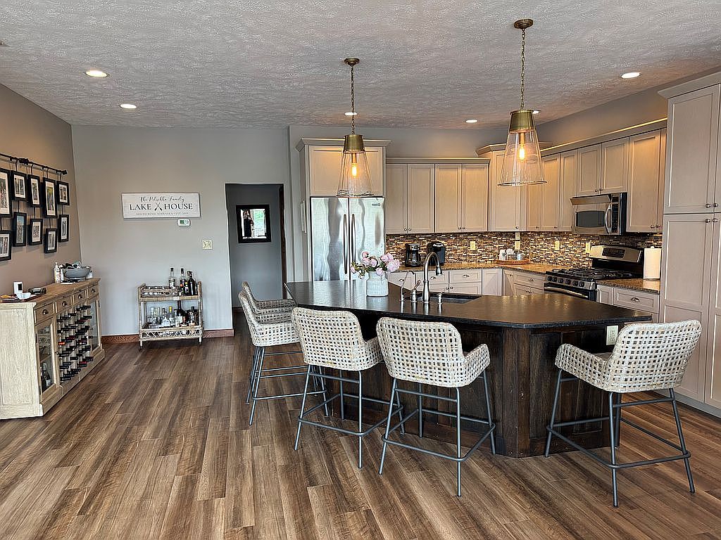 This kitchen boasts an open layout with a large, dark wood island at its center, topped with a smooth, dark countertop. Four woven rattan bar stools with metal legs provide ample seating, adding texture and warmth. The cabinetry is a soft beige tone with sleek silver hardware, complemented by a multicolored tile backsplash that adds a burst of visual interest. Stainless steel appliances, including a refrigerator and microwave, blend seamlessly with the cabinetry. Two clear glass pendant lights hang over the island, casting a warm glow. The wooden plank flooring enhances the warm, inviting atmosphere. A side wall features a wine rack and a small bar cart, reinforcing the cozy, welcoming vibe.