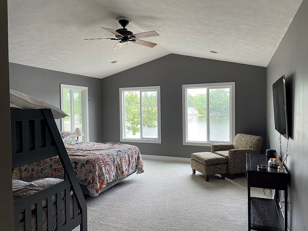 This master bedroom features a soothing, modern aesthetic with medium gray walls contrasting against white trim and plush light carpeting. Large windows dominate the far wall, offering serene views of lush greenery and a peaceful lake, flooding the room with natural light. The ceiling is vaulted, adding to the spacious feeling, and a ceiling fan with wooden blades is centrally mounted. Furnishings include a bed with a floral-pattern comforter, a dark wooden bunk bed frame partially visible, a patterned lounge chair with ottoman, and a dark console holding a flat-screen TV and minimal decor for a cozy yet uncluttered retreat.