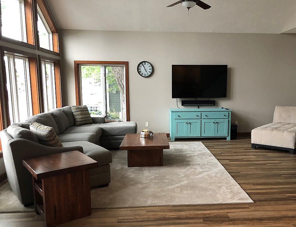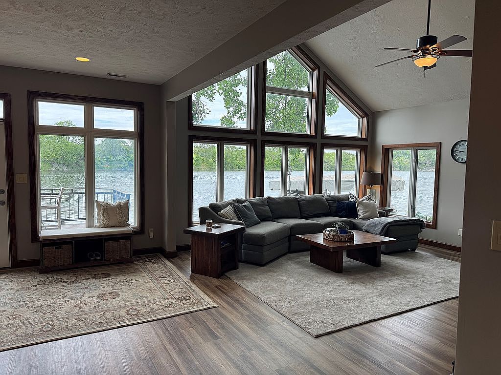 This living room features a spacious, open layout combining cozy and modern elements. The large sectional sofa in muted gray tones anchors the seating area, complemented by a matching plush area rug that defines the space on the warm wood flooring. Floor-to-ceiling windows with wooden trim frame a stunning lake view, flooding the room with natural light and connecting the interior to the tranquil outdoors. A built-in window seat with cushions and baskets beneath offers additional cozy storage and seating. A ceiling fan with a light fixture adds a functional yet stylish touch, while subtle neutral wall tones maintain a calm and inviting atmosphere.