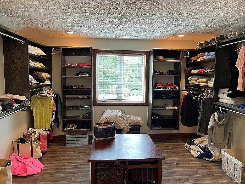 This spacious walk-in closet features dark wood shelving and hanging rods that run along three walls, providing ample storage for folded clothes, shoes, and hanging garments. The warm wood floor adds a cozy contrast to the neutral beige walls, while recessed ceiling lights create an inviting ambiance. A large window framed in wood offers natural light and a view outside. A wooden central island with wicker drawers enhances functionality, perfect for organizing smaller accessories. The space combines practicality with comfort, balancing natural light, storage efficiency, and warm earth tones for a polished, orderly look.