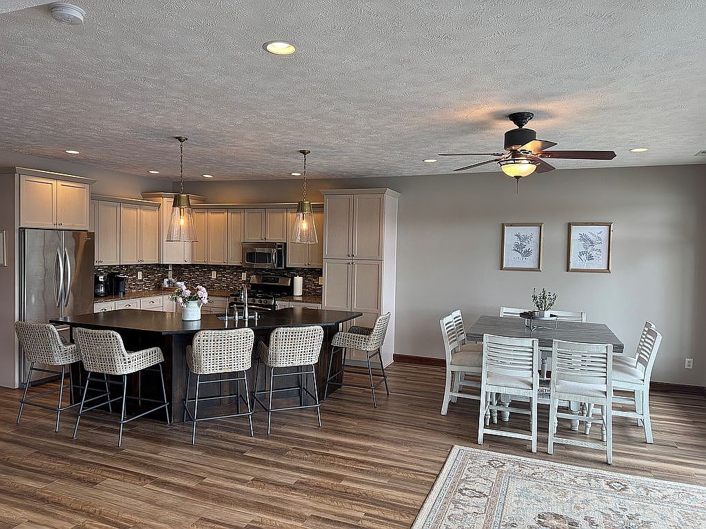 This open-concept kitchen and dining space features a blend of modern and cozy elements. The kitchen showcases cream-colored cabinetry paired with a dark island countertop, accented by two pendant lights with clear glass shades that add a warm glow. Stainless steel appliances complement the neutral tones, while a dark mosaic tile backsplash adds texture and contrast. Four woven bar stools with metal legs line the island, inviting casual seating. Adjacent is a dining area with a rectangular wooden table surrounded by six white chairs with cushioned seats, set against a light gray wall adorned with two framed botanical prints. Wood flooring throughout ties the space together, while a ceiling fan with a light fixture adds functionality and charm.