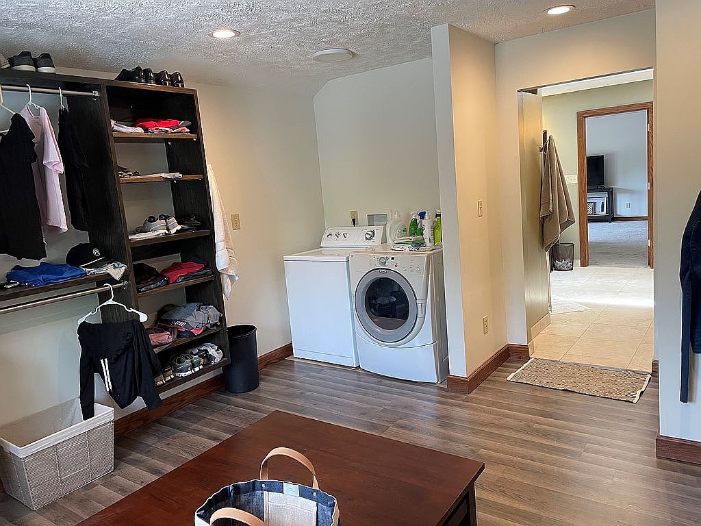 This laundry room combines utility with practical storage solutions in a cozy, well-lit space. The corner houses a white top-loading washing machine alongside a front-loading dryer, neatly positioned against a light beige wall. Adjacent to the laundry appliances is a dark wooden open shelving unit, organized with folded clothes, shoes, and hanging garments, providing ample storage for daily wear. The room’s flooring is a warm, wood-look laminate that contrasts softly with the white appliances. A small brown bench or table occupies the center, perfect for folding. Neutral tones and wood trim subtly frame the passage leading to an adjoining tiled room, adding functional flow to the space.